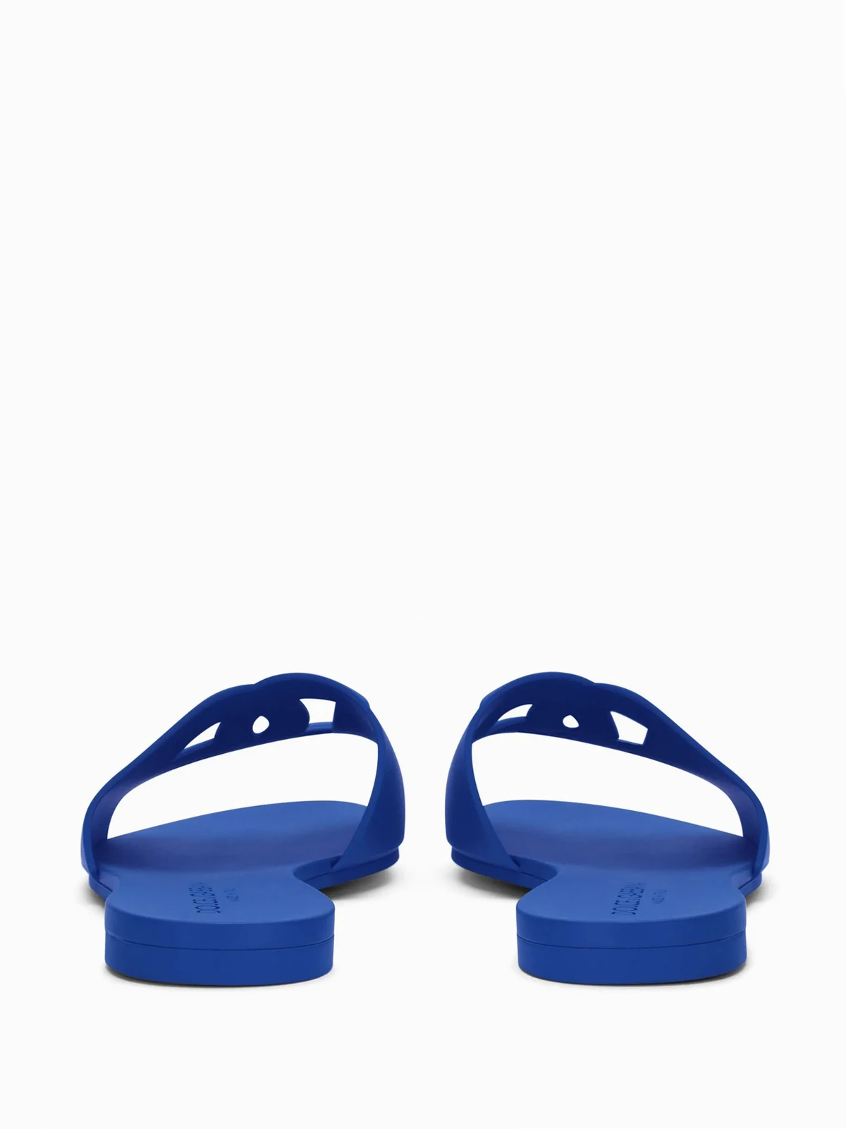 Marineblau, Lettering-Logo, zehenfrei, ohne Verschluss, Logo-Prägung im Fußbett, flache Sohle.