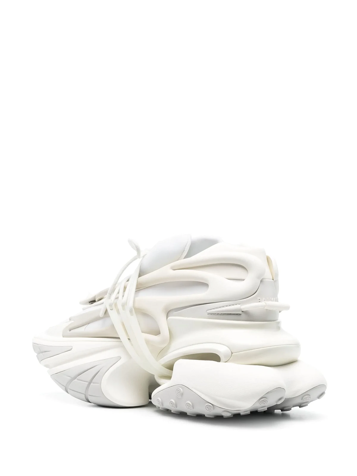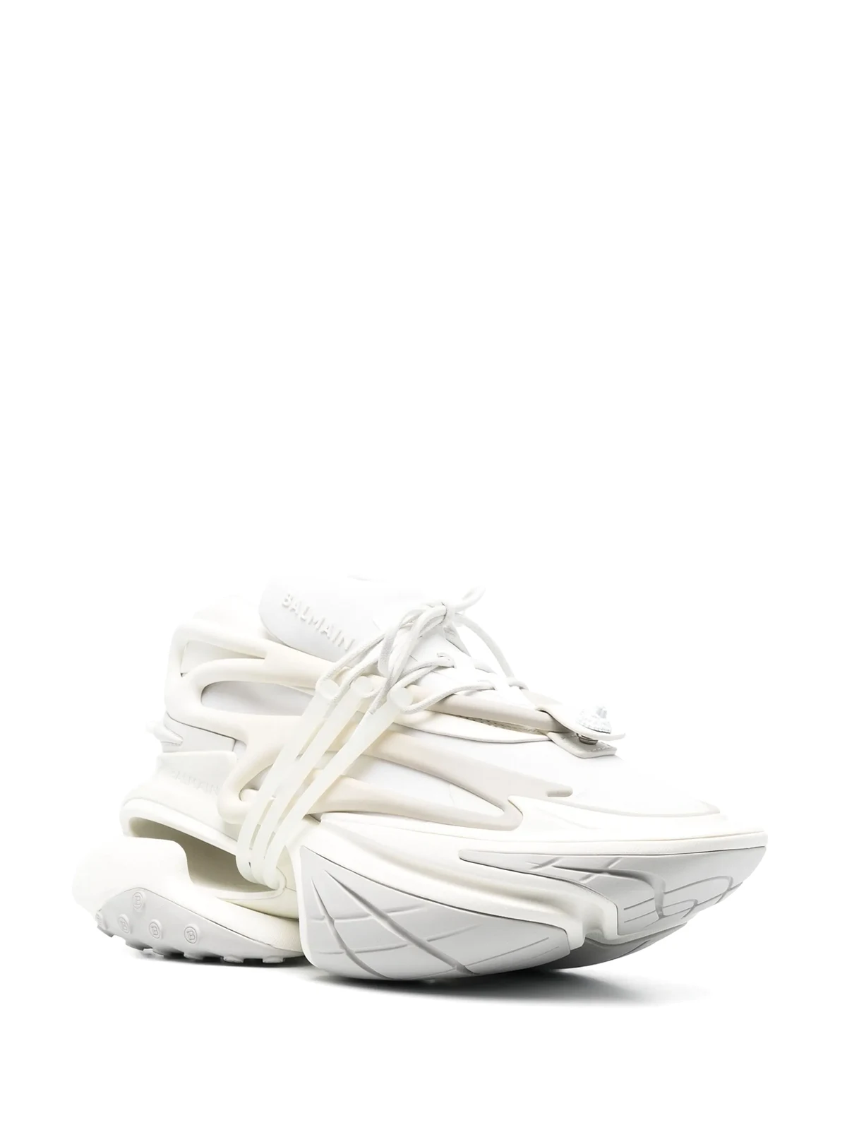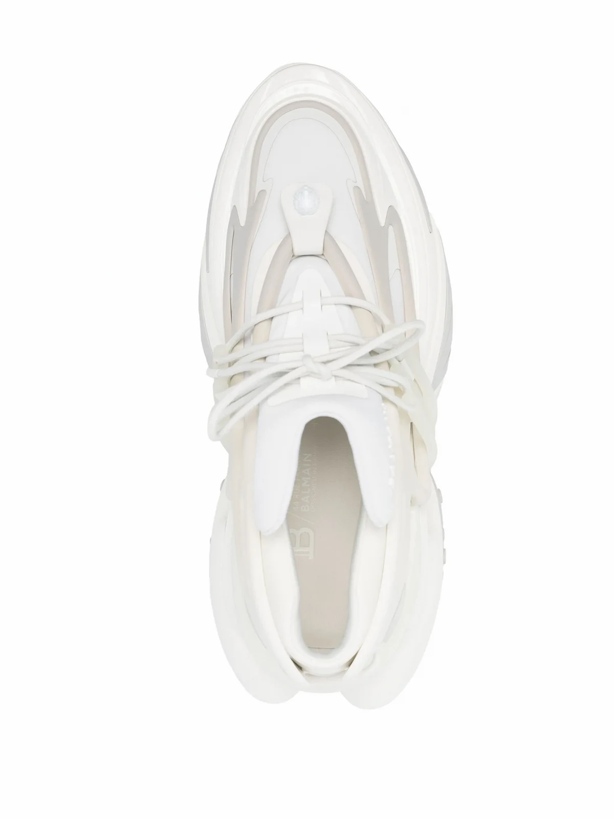 Weiß, Kalbsleder, Kontrastdetails, verzierter Logo-Print, spitze Kappe, Schnürung vorne, Logo-Prägung im Fußbett, klobige Gummisohle.