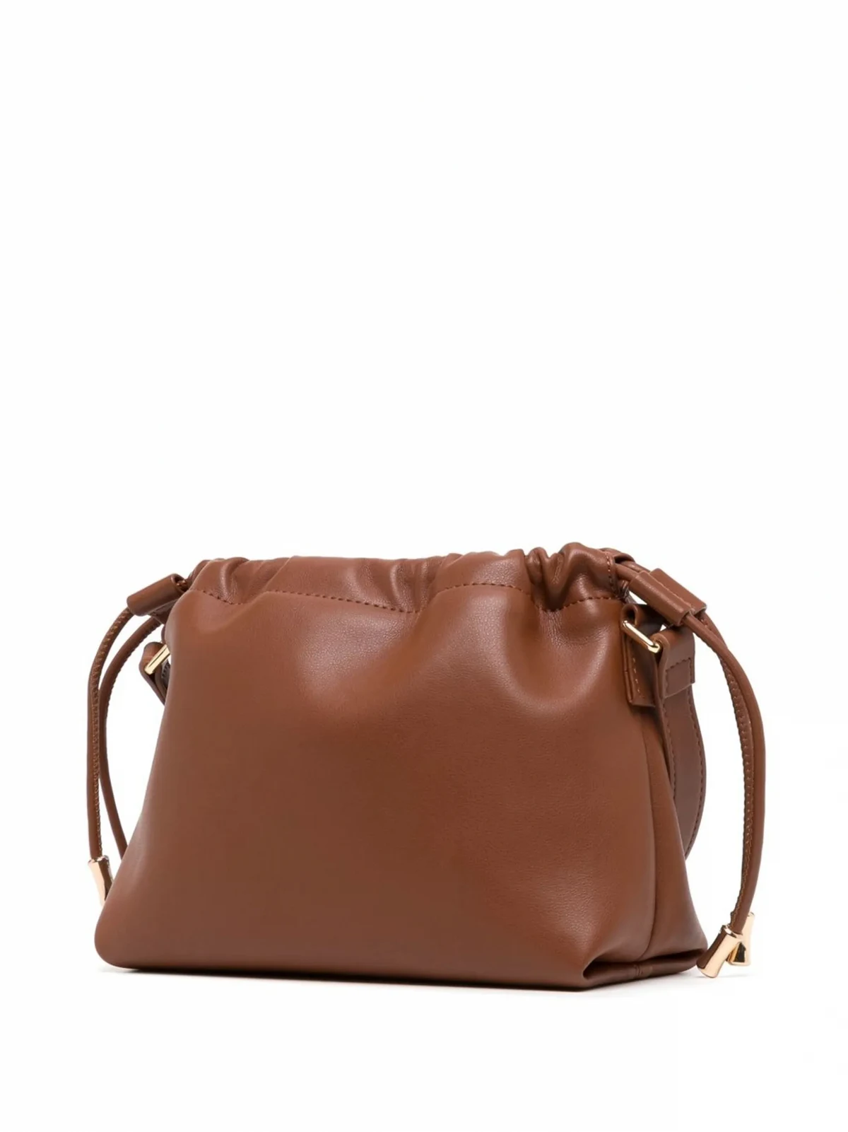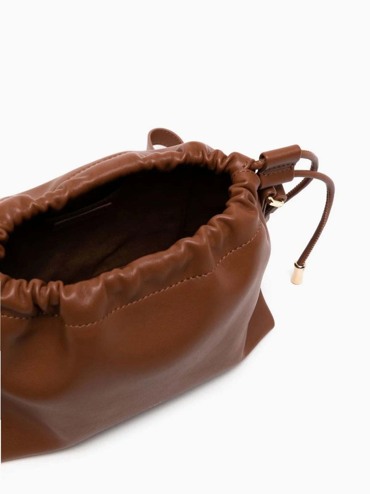 Braun, Faux-Leder, goldfarbenes Logo, verstellbarer Schulterriemen, Kordelzug oben, verdeckter Magnetverschluss, Hauptfach, Eingrifftaschen innen.