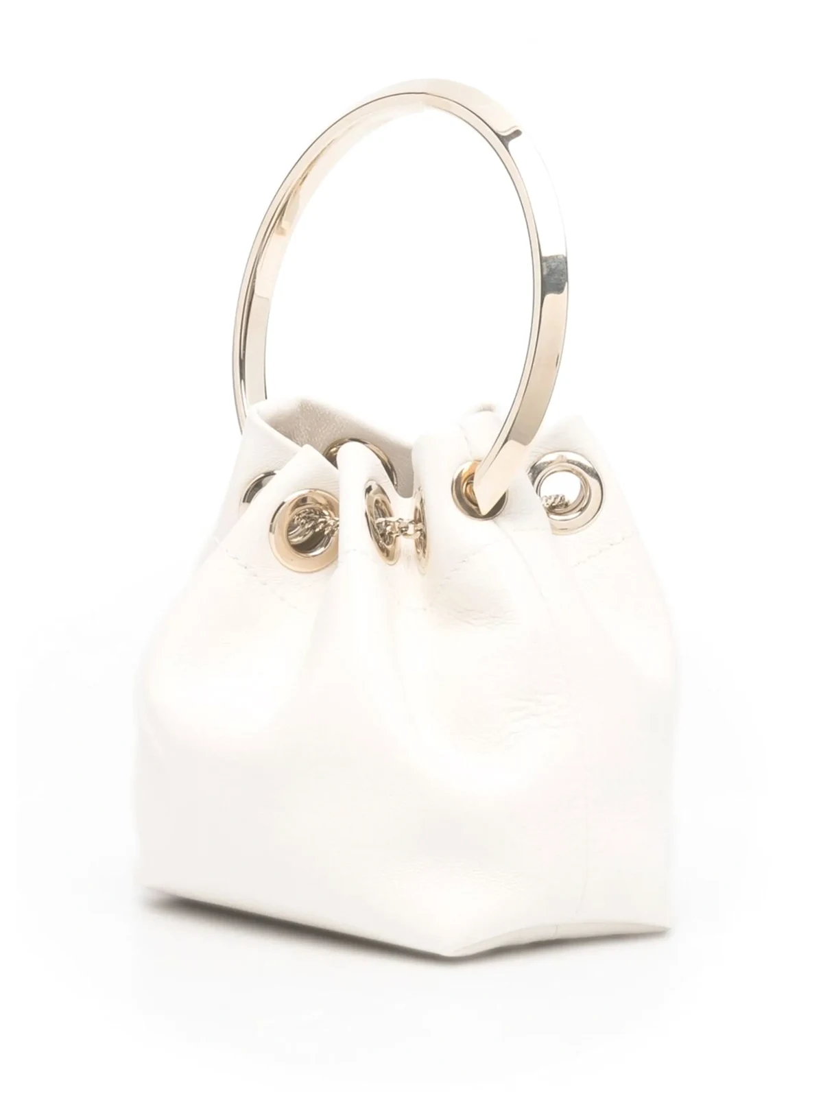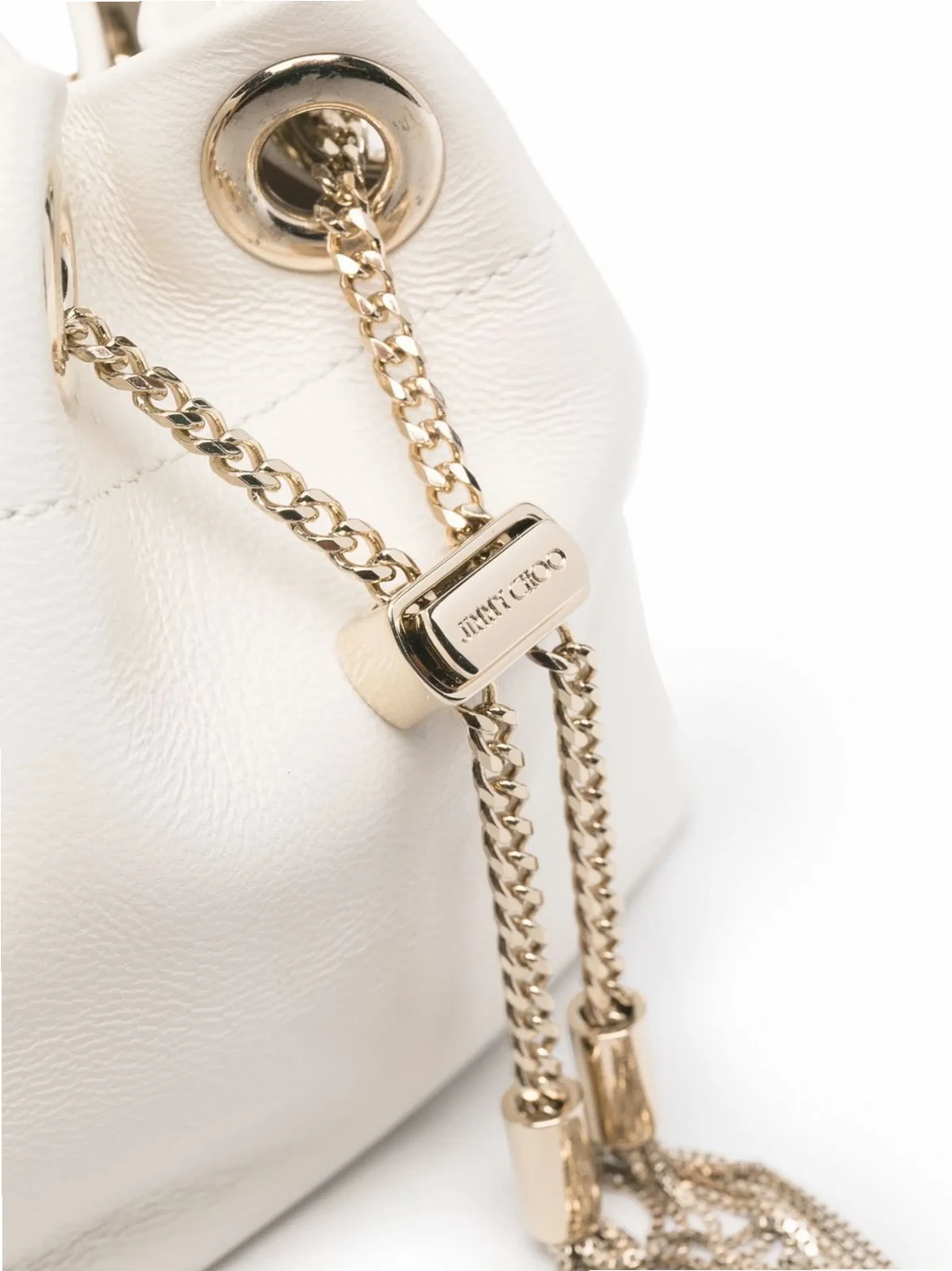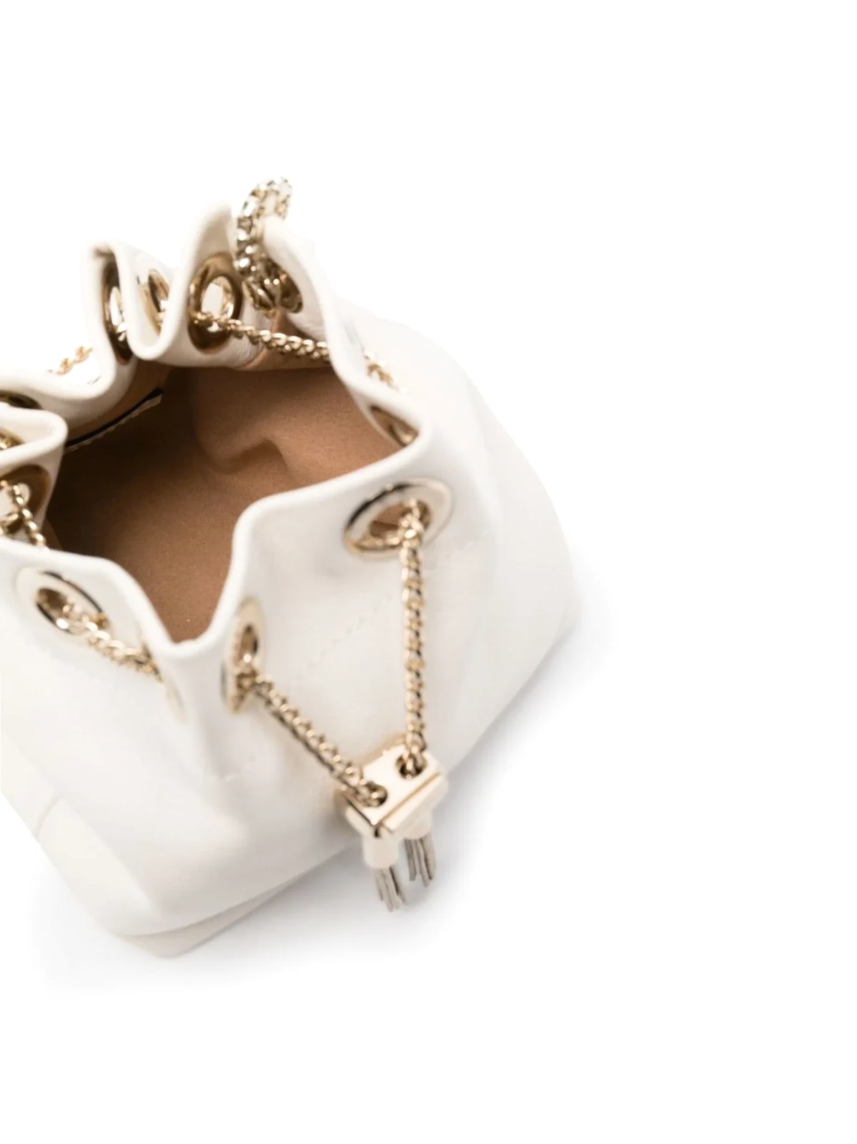 Weiß, Leder, Schulterriemen mit Kette, runder Henkel, Metallquasten.
