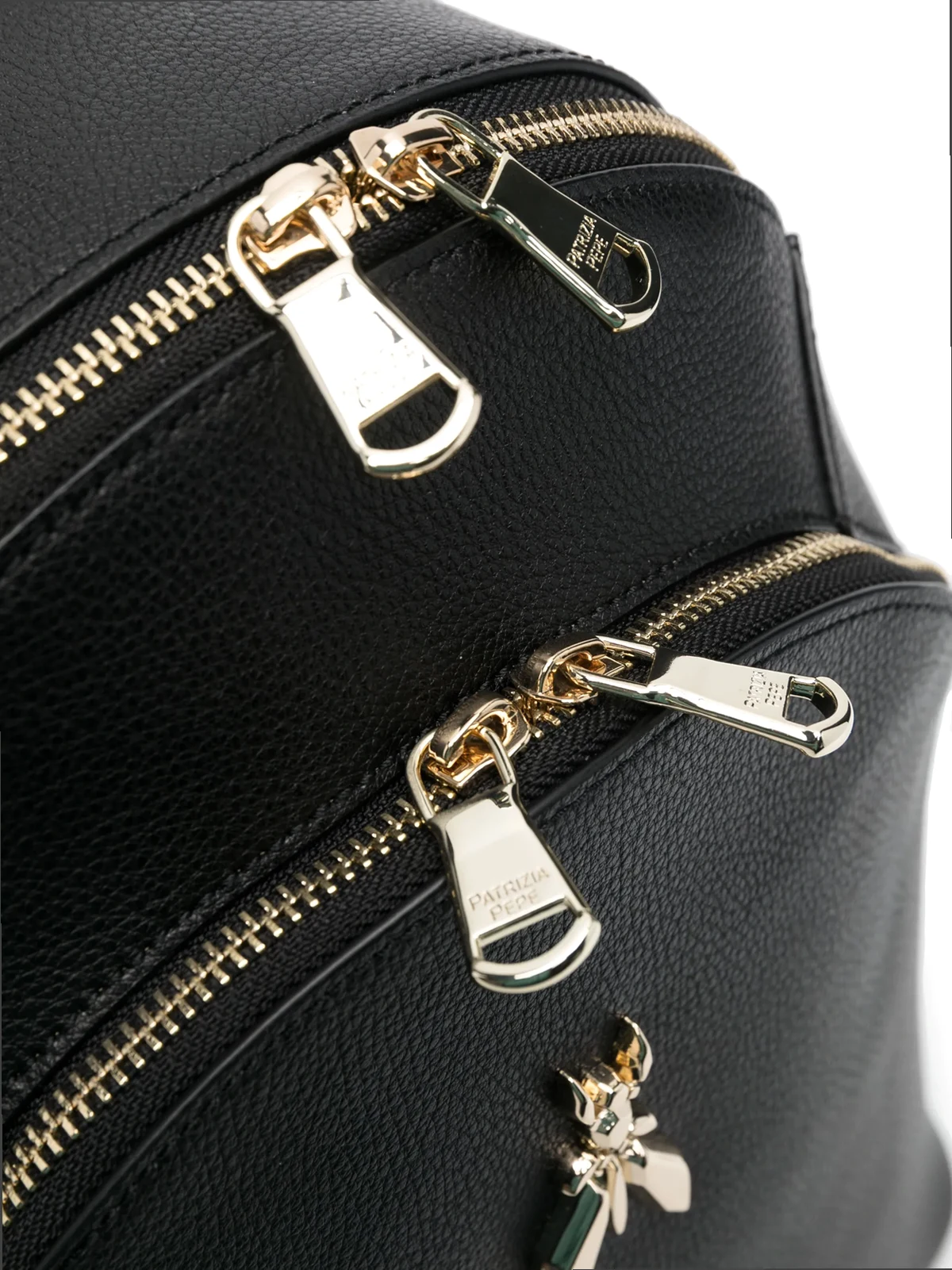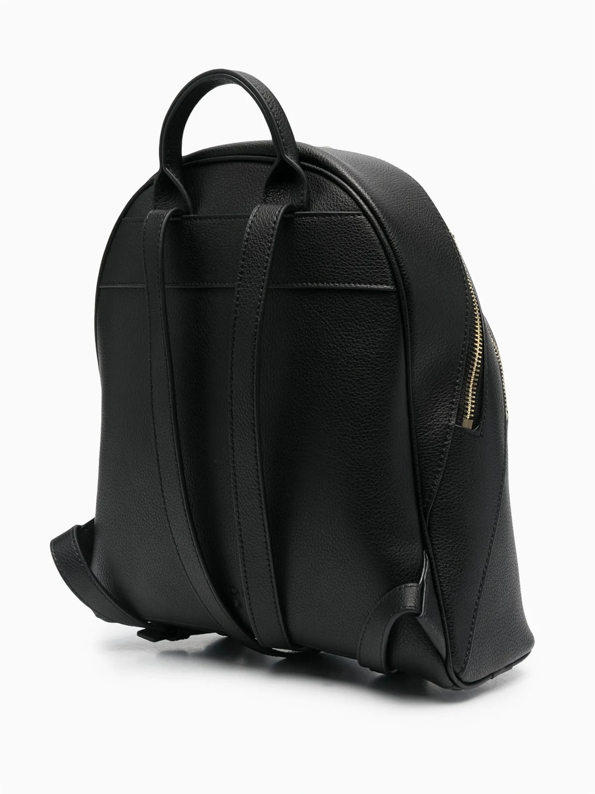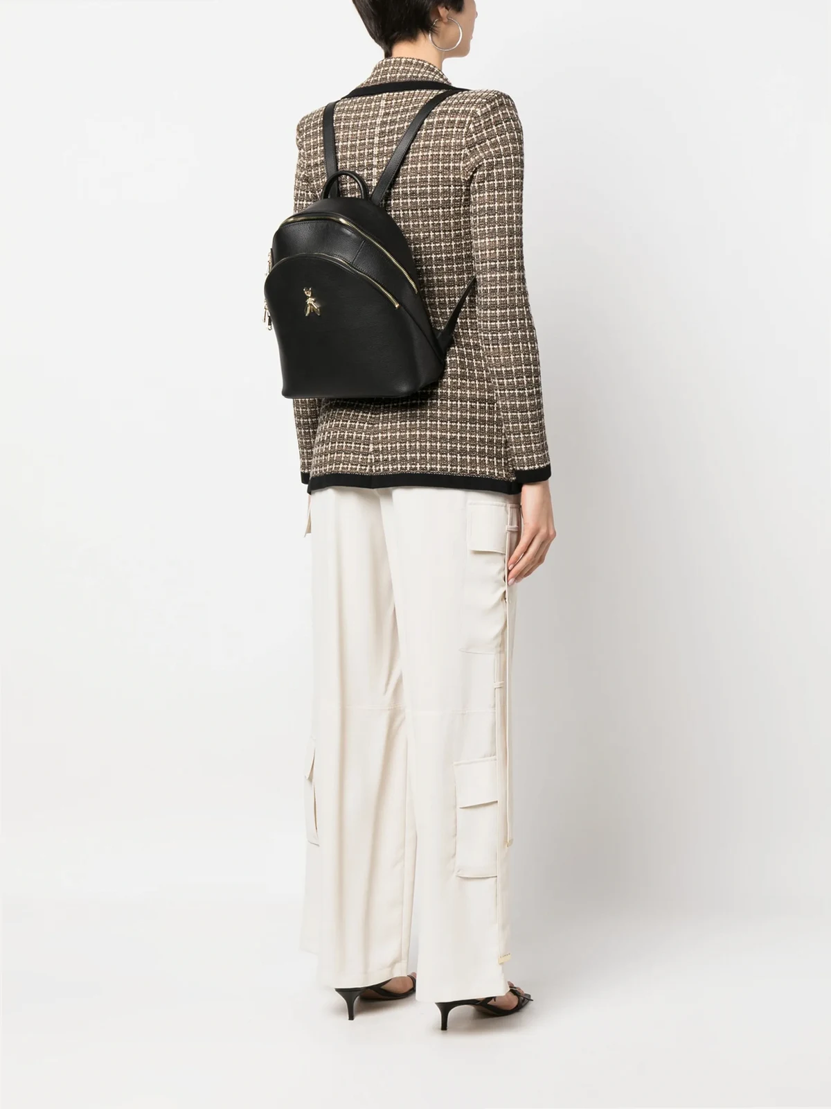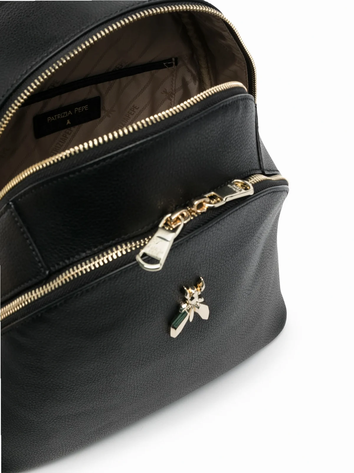 Schwarz, Kalbsleder, goldfarbene Beschläge, Logo-Schild, einzelner Henkel, zwei verstellbare Schulterriemen, Reißverschluss oben, Hauptfach, Logo-Patch an der Innenseite.