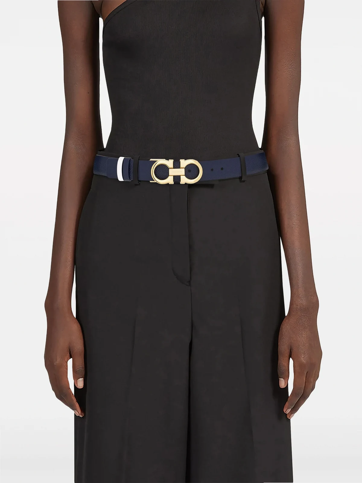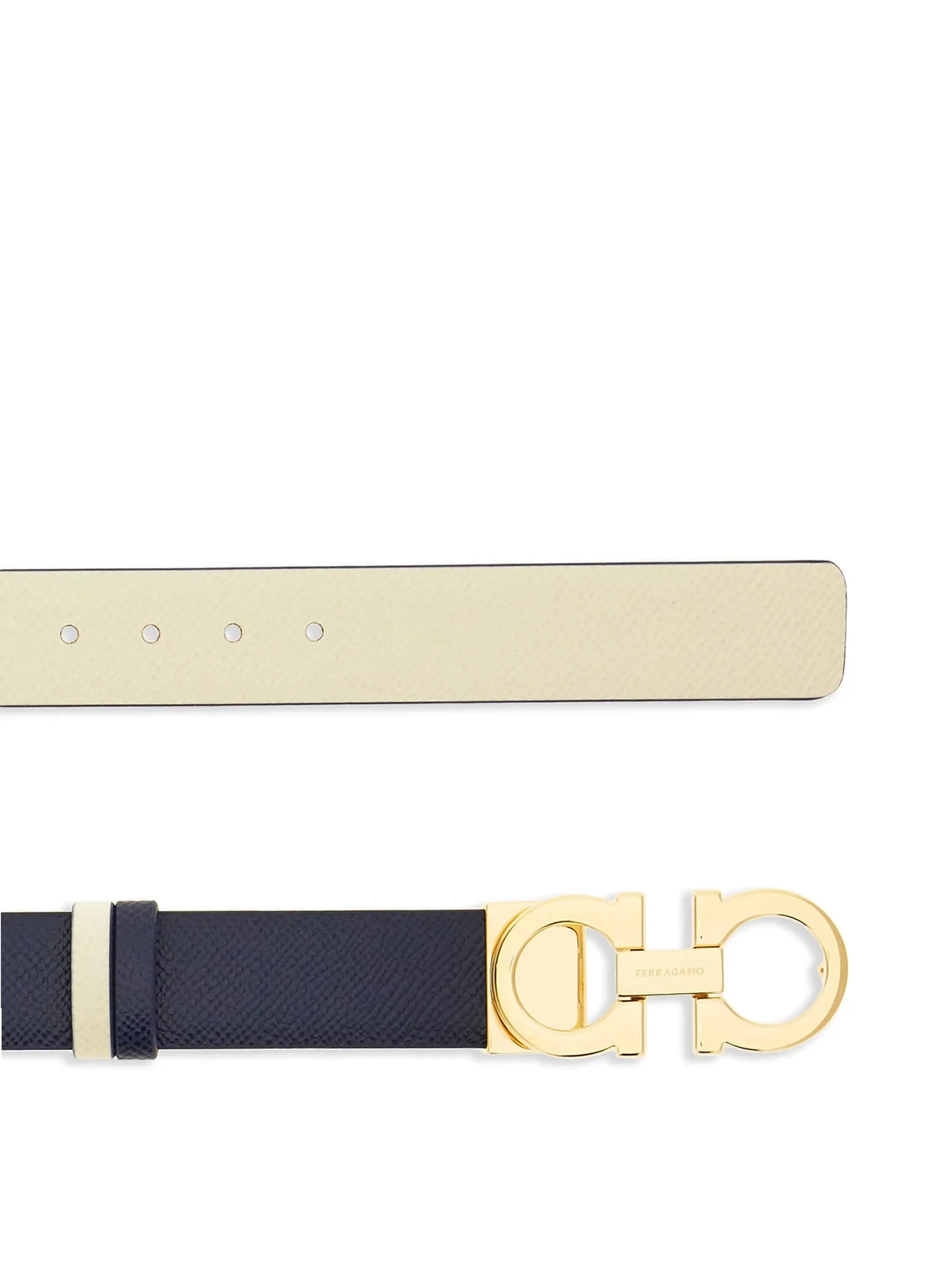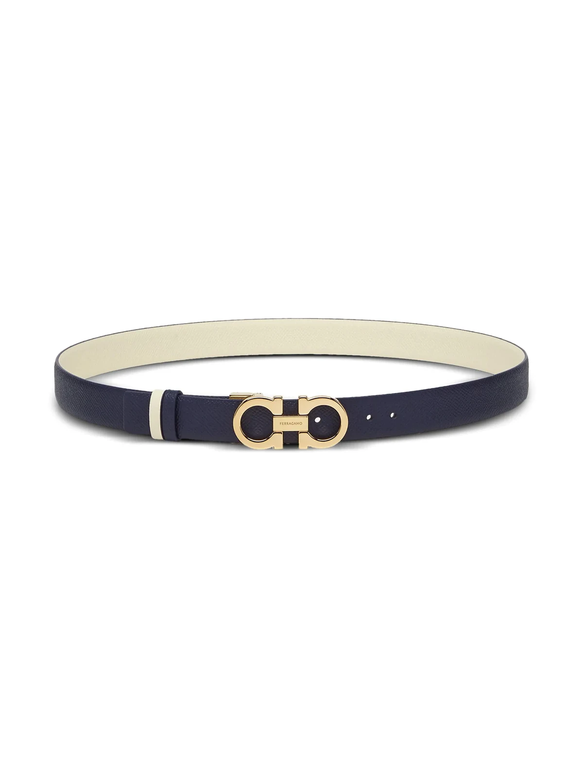 Blau, Cremeweiß, Kalbsleder, wendbares Design, Gancini-Schnalle, goldfarbene Beschläge, variable Passform.