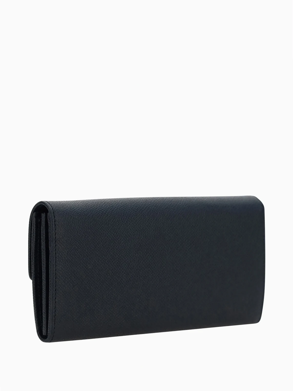 Schwarz-goldfarbenes Portemonnaie aus Kalbsleder von Salvatore Ferragamo mit folgenden Eigenschaften: Klappdeckel, rechteckige Form, Reißverschlusstasche innen, "Gancio"-Schnalle und Logo-Stempel innen.