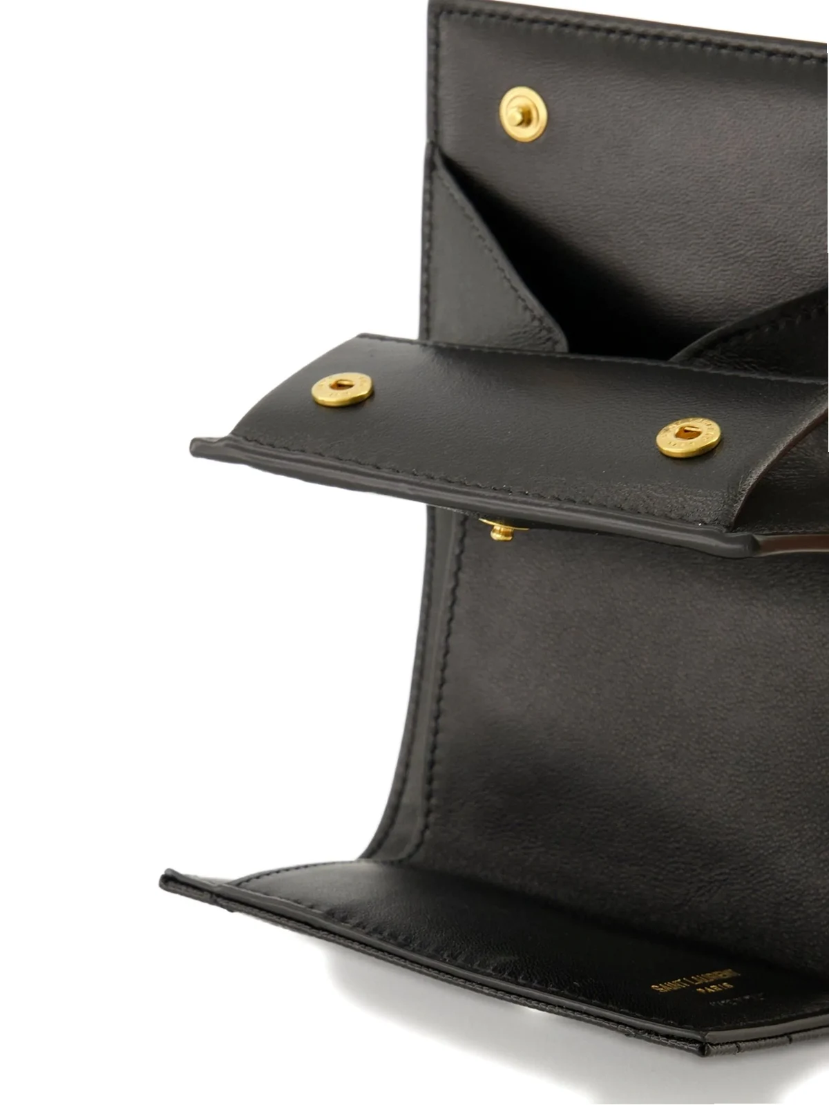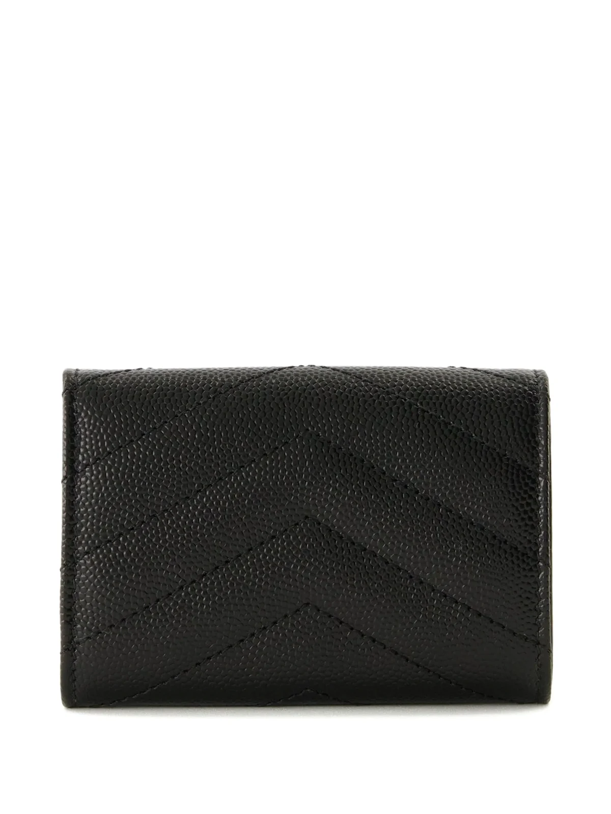 Strukturiertes Design, Chevron-Steppung, ikonisches YSL-Logo, goldfarbene Beschläge, Druckknopfverschluss, Geldscheinfach, Logo-Stempel innen. Farbe: Schwarz. Material: Leder.