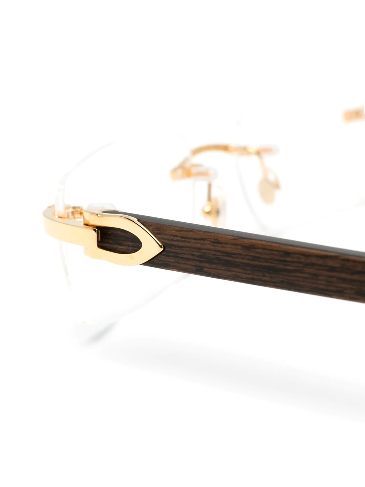 Eckiges Gestell, rahmenlose Gläser, goldfarbene Beschläge, gerade Bügel, Nasenpads. Inklusive Schutzbeutel – damit auch unterwegs keine Flecken oder Kratzer entstehen .