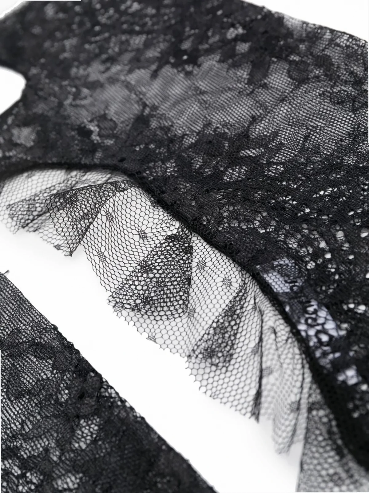 Schwarz, florales Spitzenmuster, Rüschensaum , fingerloses Design.