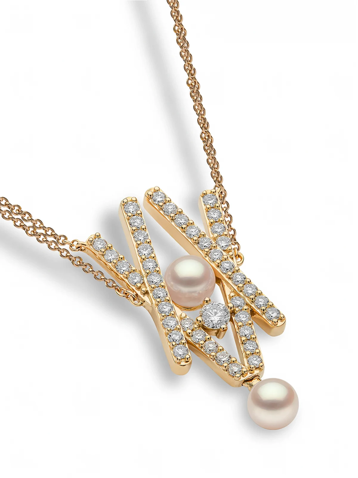 Karabinerverschluss, verstellbare Kette, Akoya-Perle, Diamanten mit Rundschliff.