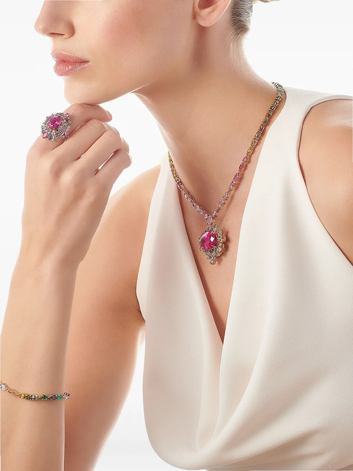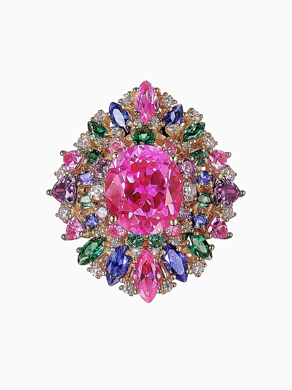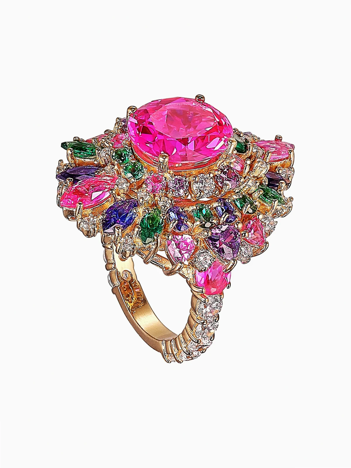 18kt Gelbgold-Vermeil 100%, synthetischer violetter Amethyst 100%, synthetischer fuchsiafarbener Saphir 100%, simulierter Smaragd 100%, simulierter weißer Diamant 100%