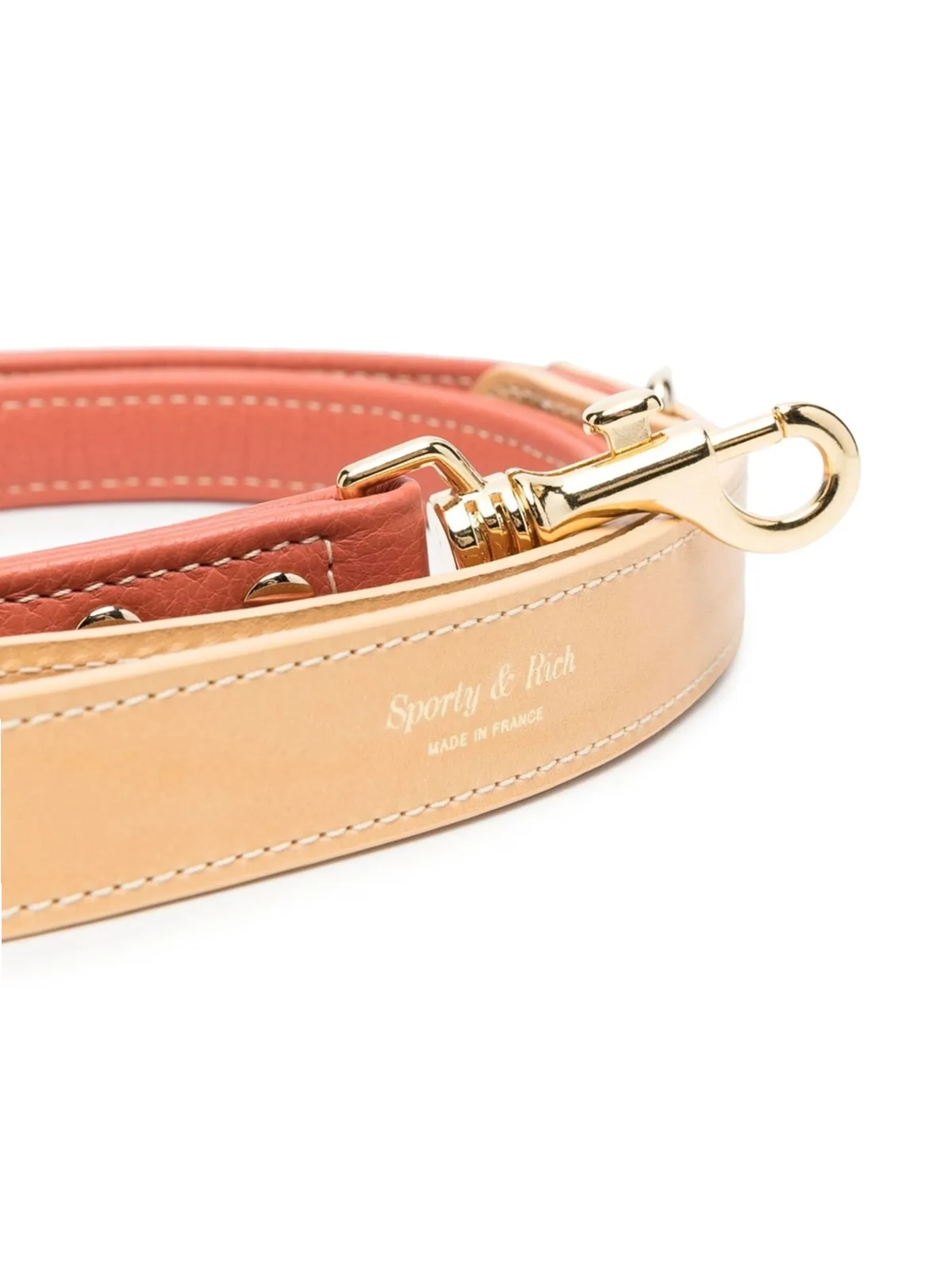 Korallenrosa, Leder, goldfarbenes Logo, goldfarbene Beschläge, Karabinerverschluss, Handgelenkschlaufe.