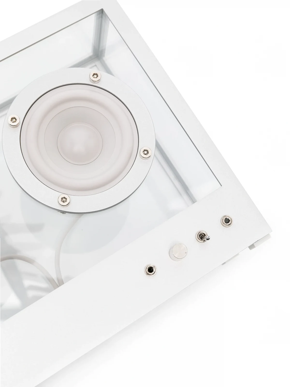 Wollweiß, Aluminium, Glas, transparentes Design, Bluetooth®-Verbindung, Wechselstrombetrieb.