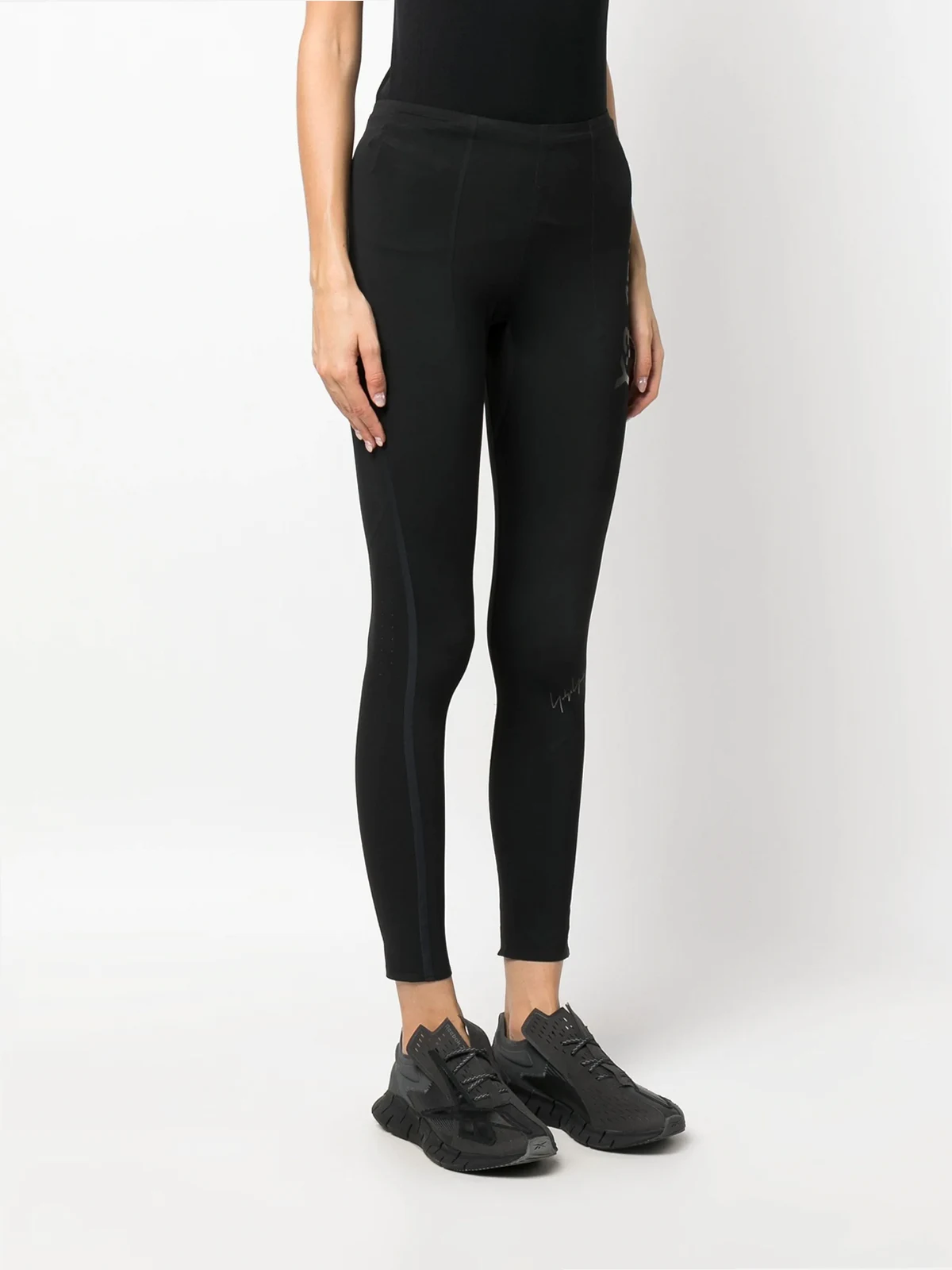 Schwarz, recyceltes Polyamid-Gemisch, Stretch-Design, Logo-Print am Bein, taillenhoher Schnitt, reflektierende Details, knöchelhoch. .