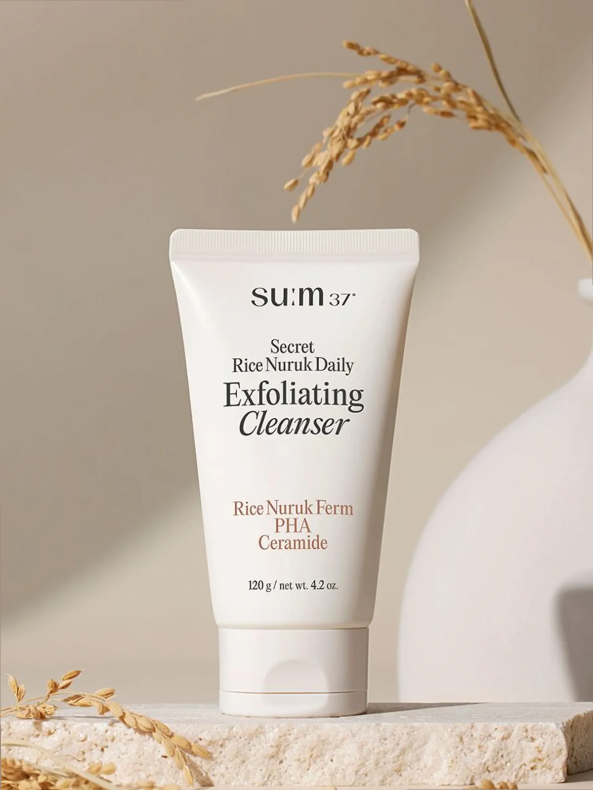 A 3-step transforming cleanser begins as a rice fermentation dough, then exfoliates, and finally transforms into a rich foam.