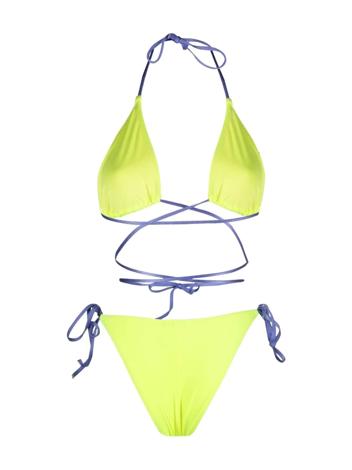 Neckholder-Ausschnitt, Triangel-Design, Wickeloptik, Bindegürtel, gleichfarbige Nähte, Schleifenverschluss an der Seite, hoch sitzend. Swimwear kann nur über Ihrer eigenen Unterwäsche anprobiert werden. Taucherbrille und Schnorchel sind optional....