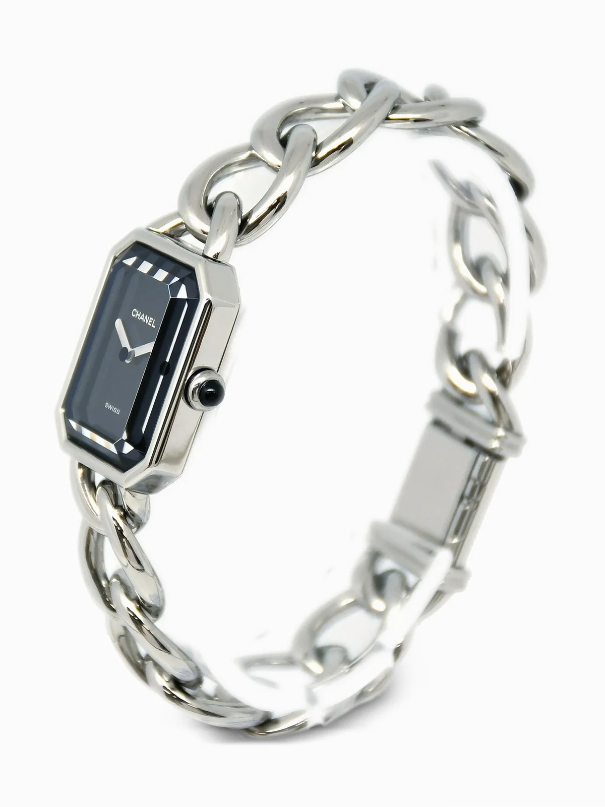 Schwarz, achteckiges Zifferblatt, Edelstahlgehäuse, Edelstahlarmband, Mineralglas, Baton-Zeiger, Quarzwerk, Krone mit Cabochon, Spangenverschluss. Zustand: GUT. Dieser Artikel ist in gutem Zustand, mit minimalen Gebrauchsspuren, z. B. an Material oder Beschichtungen, Kratzer, usw. . .
