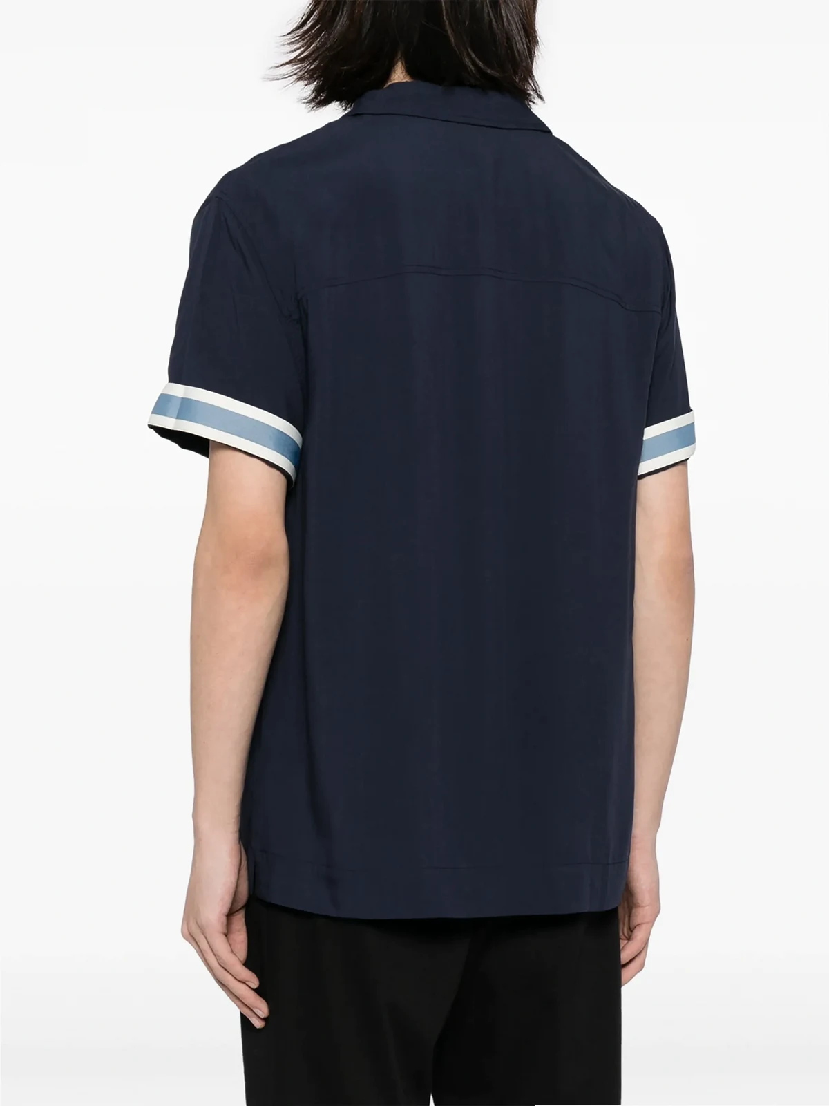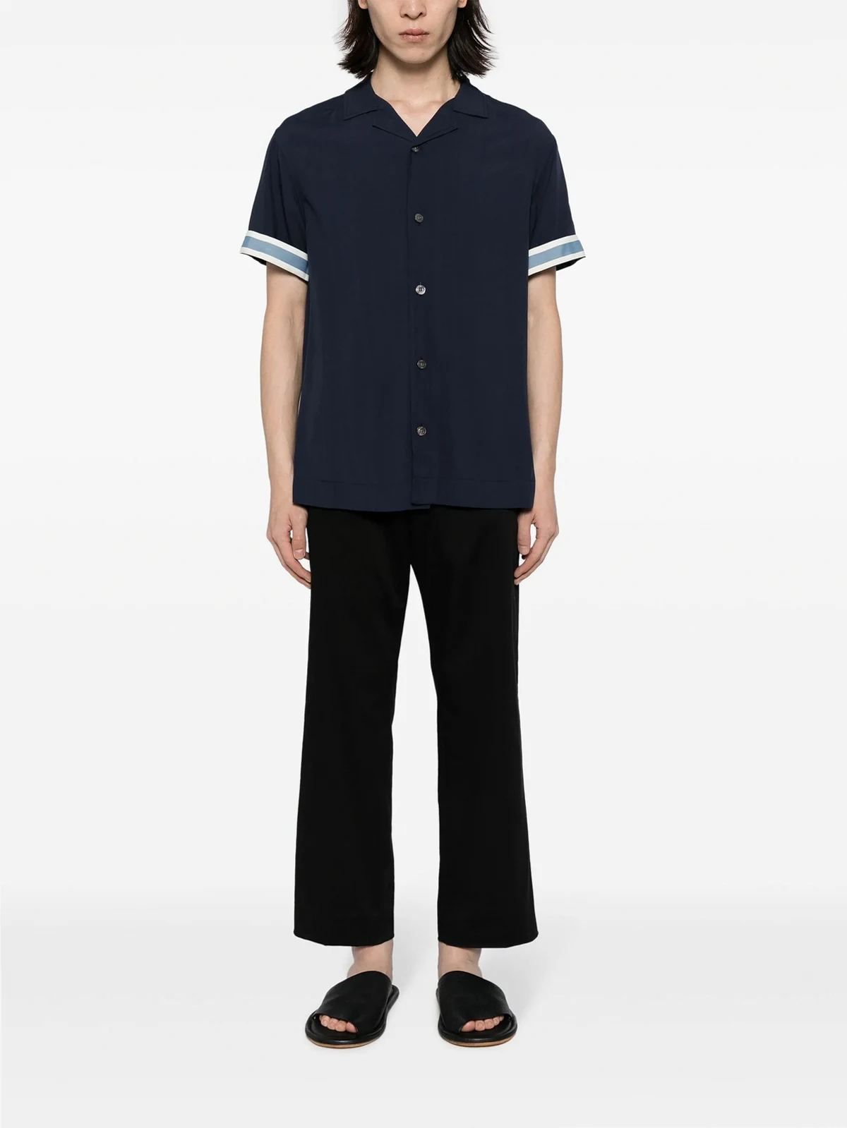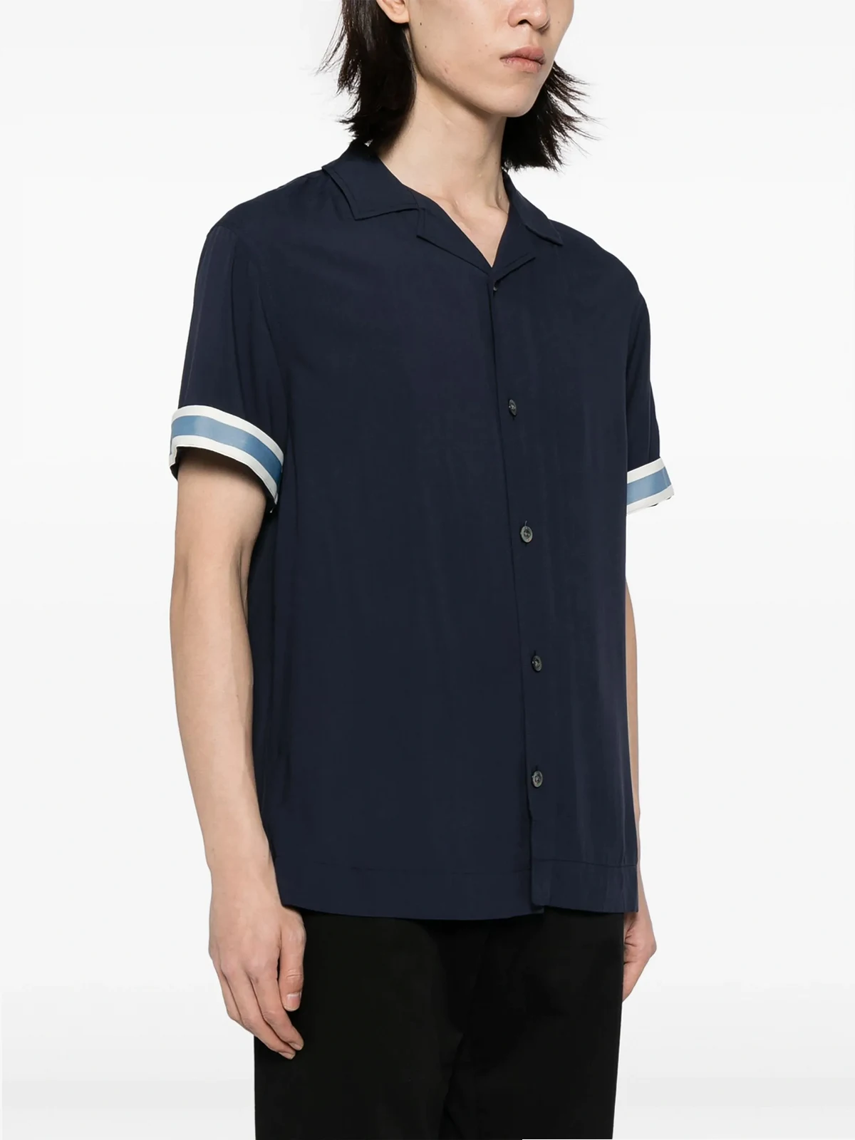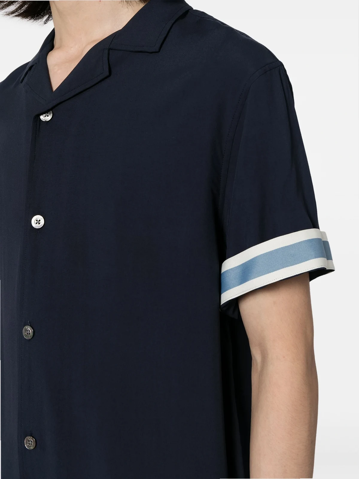 Gleichfarbige Nähte, Streifendetails, Cuban-Kragen, Knopfverschluss vorne, kurze Ärmel, gerader Saum.