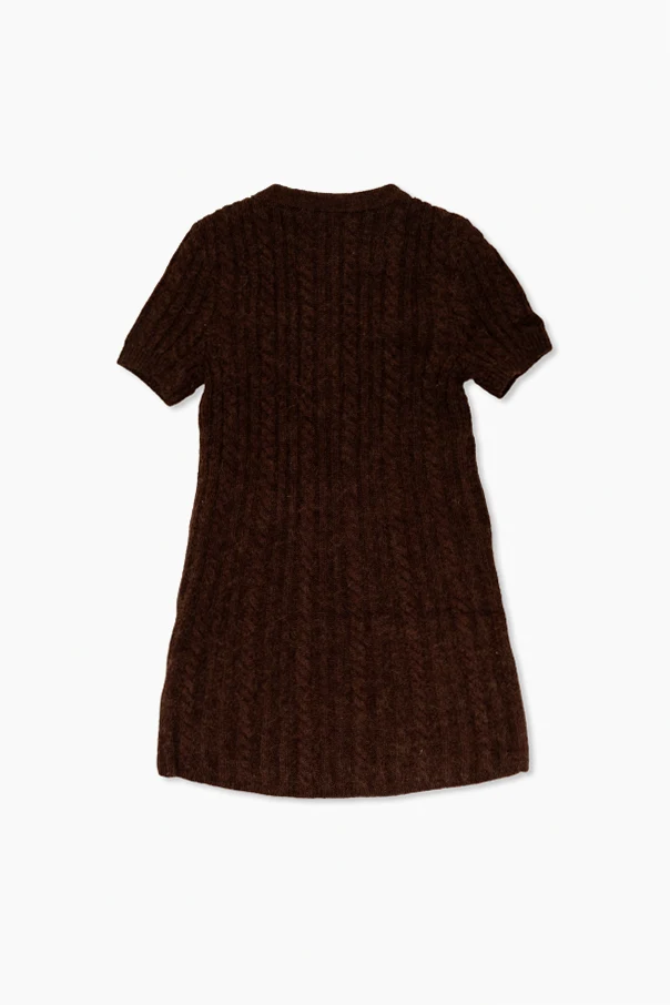 Ein schickes Kleid mit markantem, vertikalem Zopfmuster strahlt in edlem Braun und fügt sich harmonisch in die Ästhetik exklusiver Kinderkollektionen ein. Die klassische Silhouette – ein gerader Schnitt in knielanger Ausführung, mit kurzen Ärmeln und leicht ausgestelltem Rock – betont die Feinheit sowie den zeitlosen Charakter.