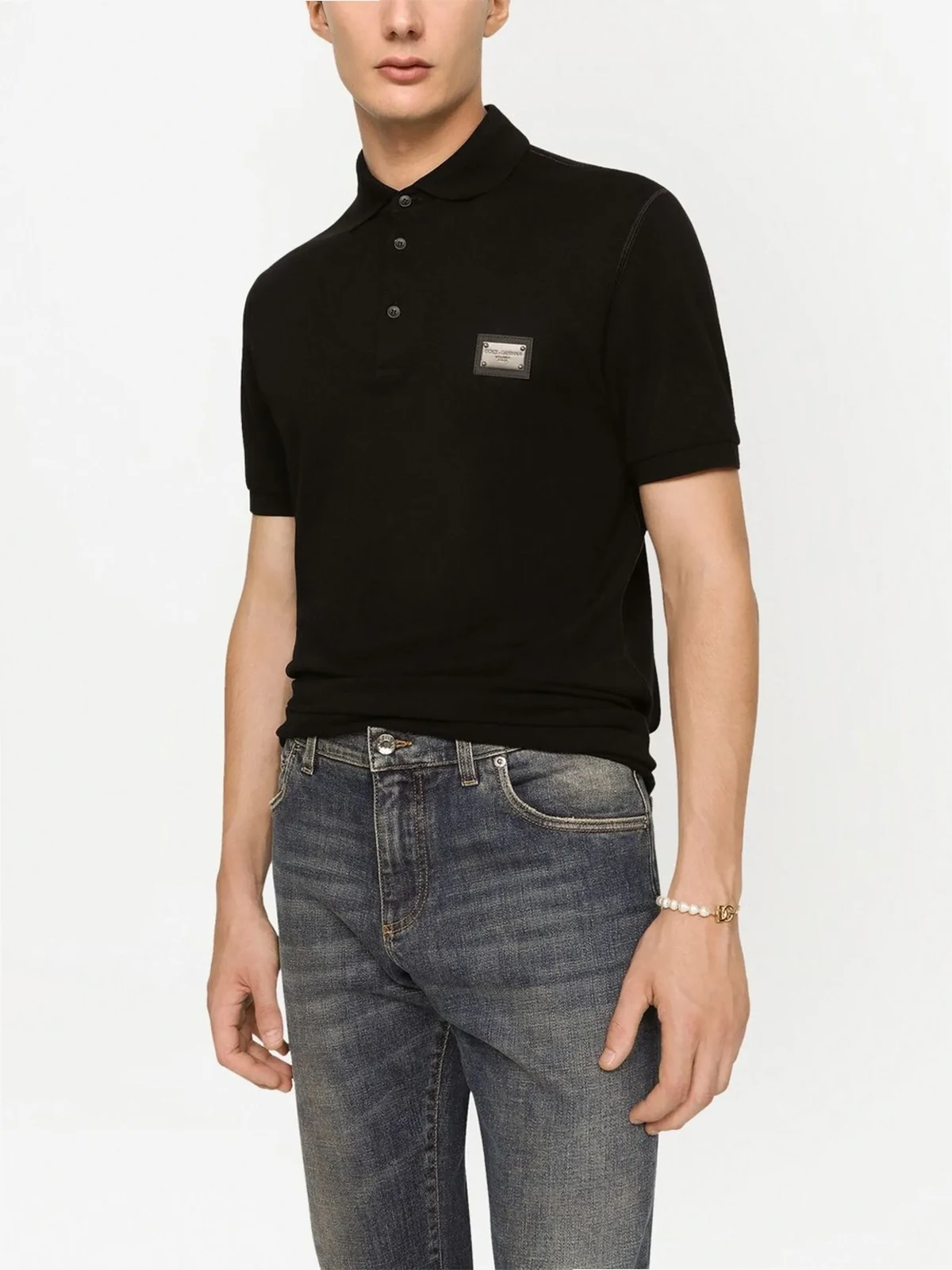 Schwarz, Baumwolle, silberfarbenes Logo-Schild, Poloshirtkragen, Knopfleiste vorne, kurze Ärmel, gerader Saum.