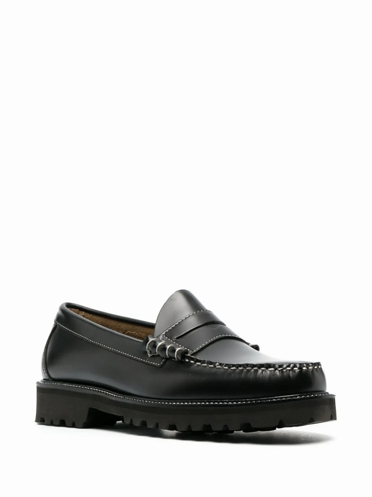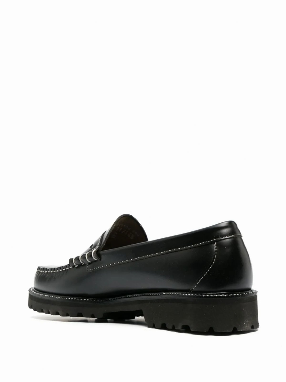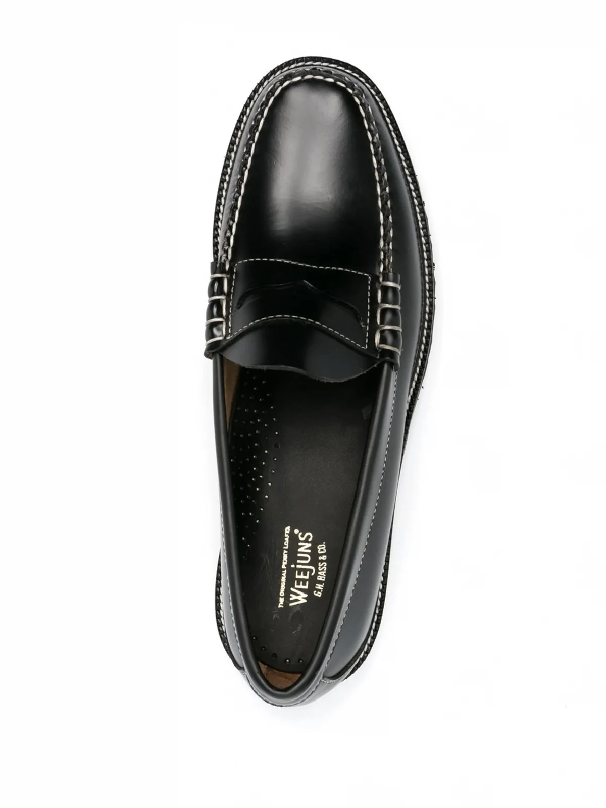 Schwarz, Kalbsleder, Glattleder, poliertes Finish, Kontrastnähte, Lederinnensohle mit Logo-Prägung, Penny-Riemen, runde Kappe, EVA Zwischensohle, ohne Verschluss, geriffelte Gummisohle.