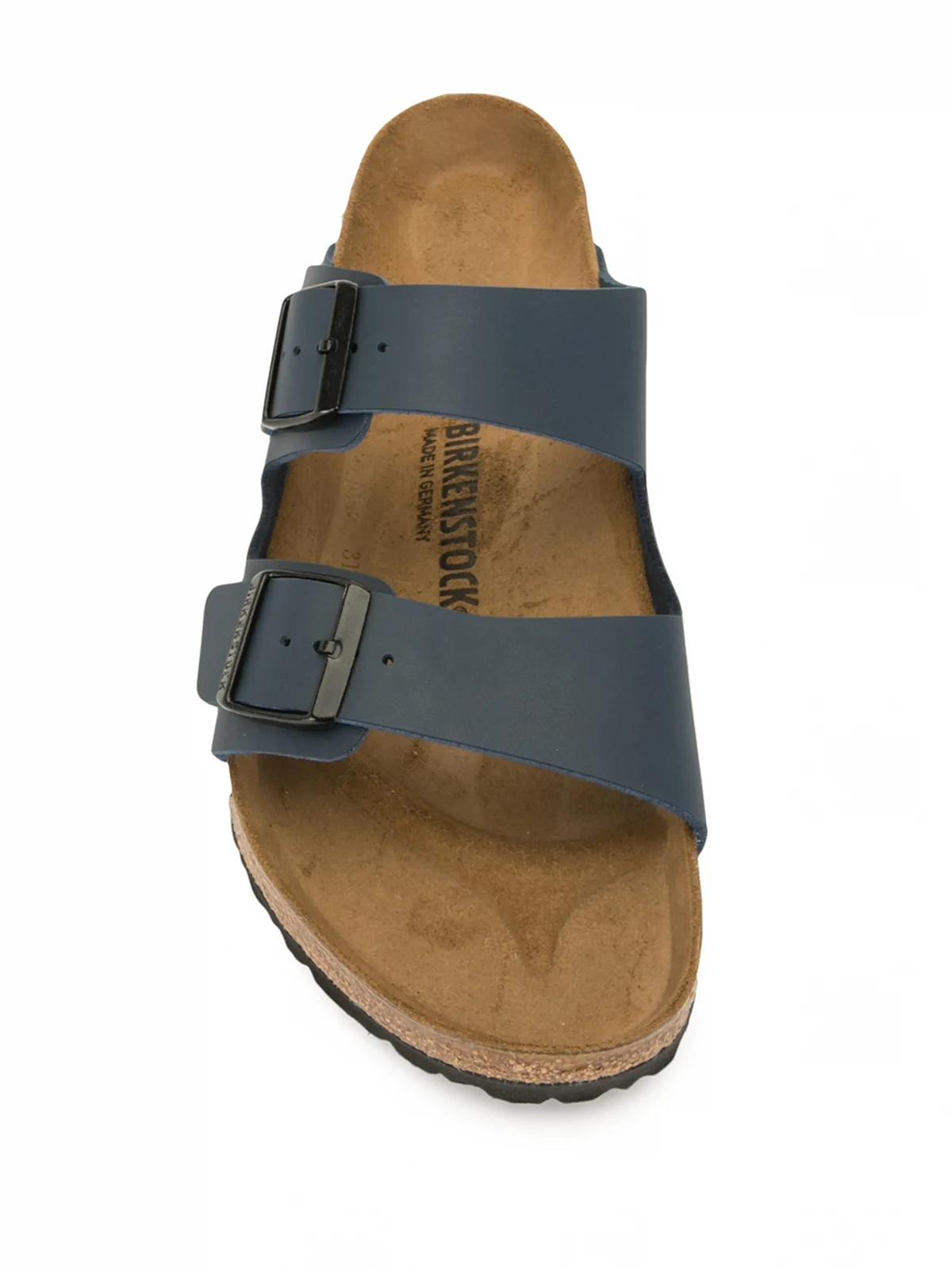 Schnallenverschluss, zehenfrei, ohne Verschluss, flache Sohle, Logo-Prägung im Fußbett. Farbe: Blau.