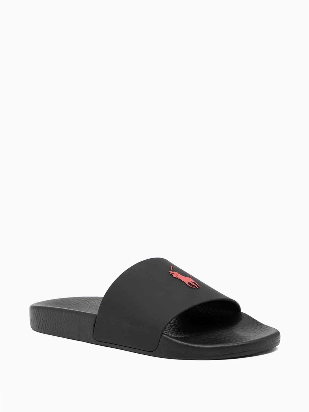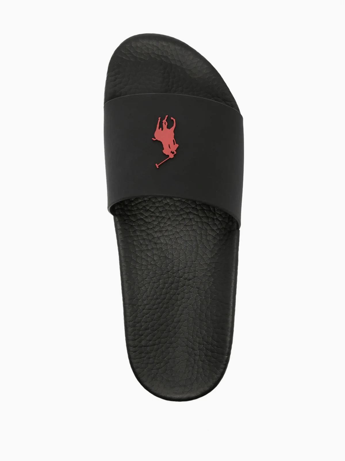 Ikonisches Polo Pony-Motiv, zehenfrei, geformtes Fußbett, flache Gummisohle. Farbe: Schwarz.