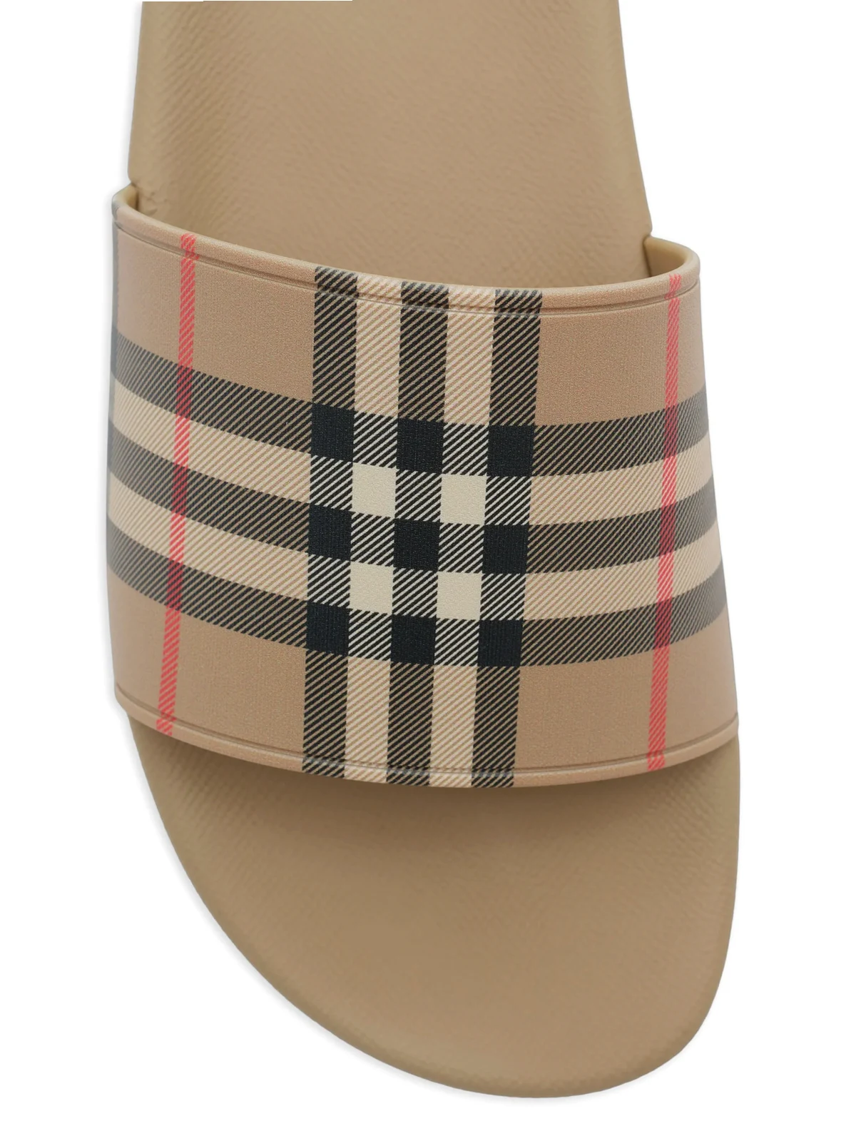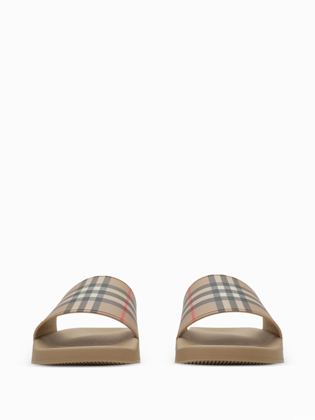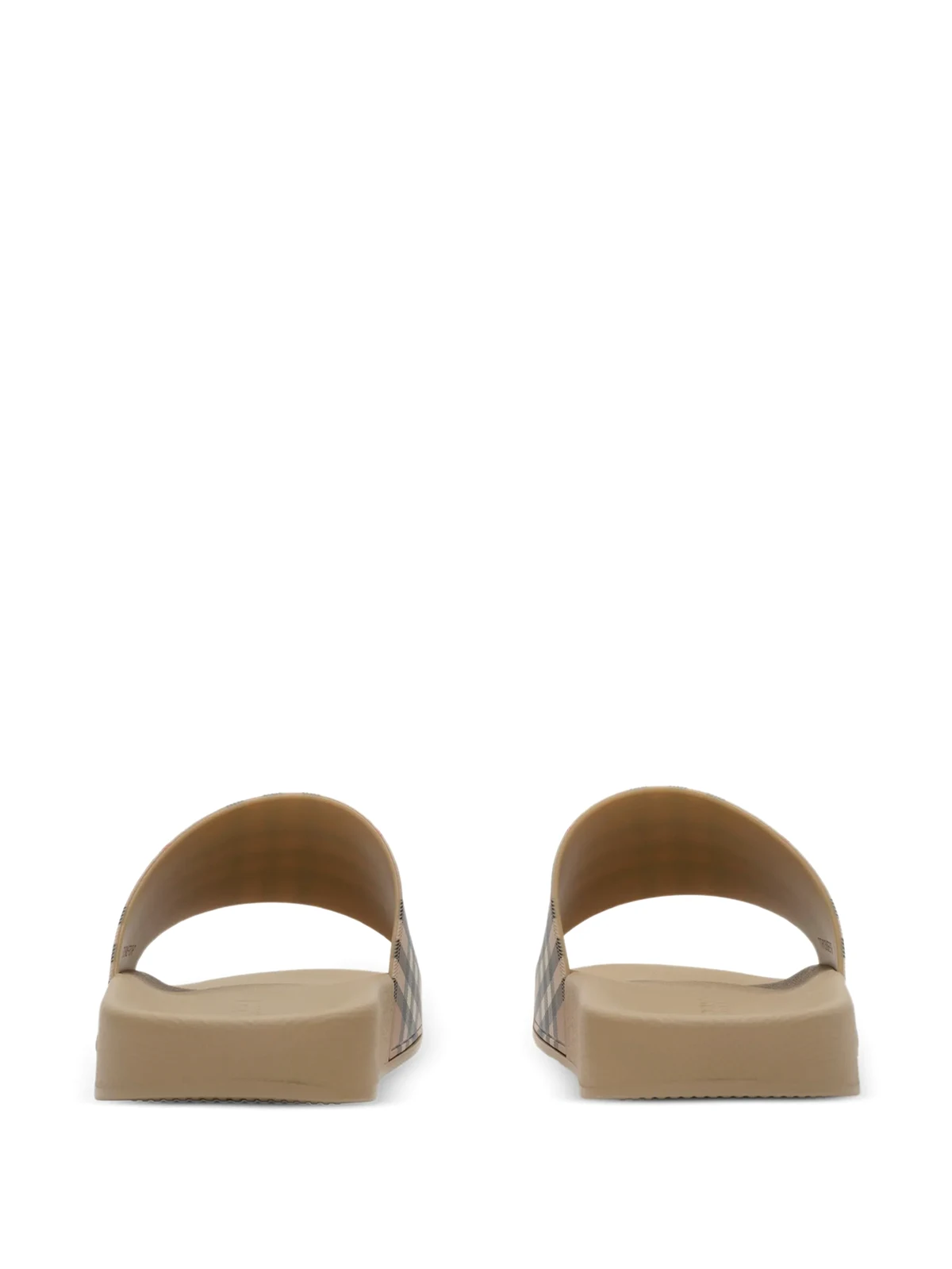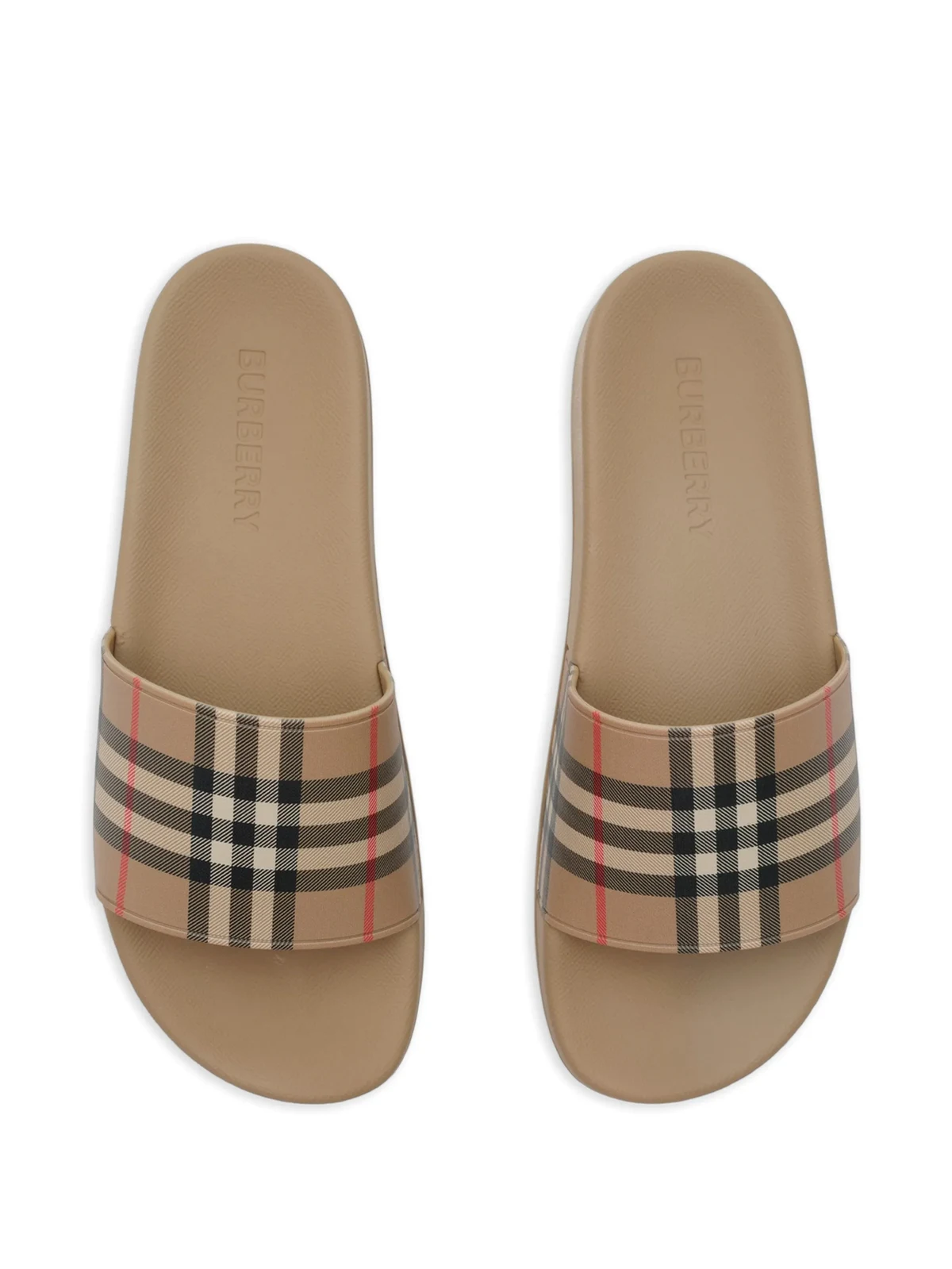 A pair of slides made in Italy, printed with the Burberry Check in signature archive beige. contoured insole embossed Burberry lettering at side