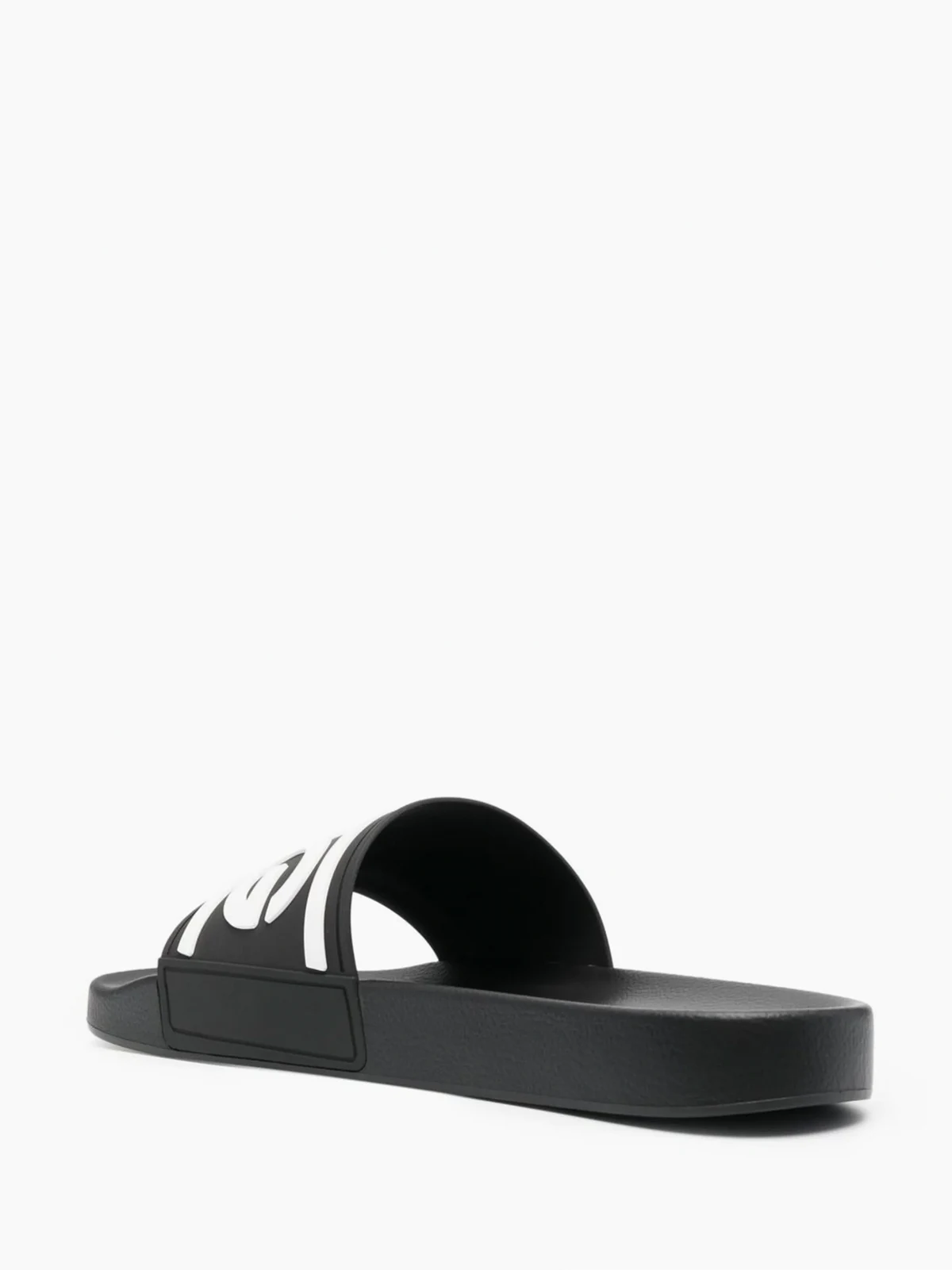 Schwarz/Weiß, ohne Verschluss, Logo-Print vorne, seitlicher Logo-Print, zehenfrei, flache Gummisohle.