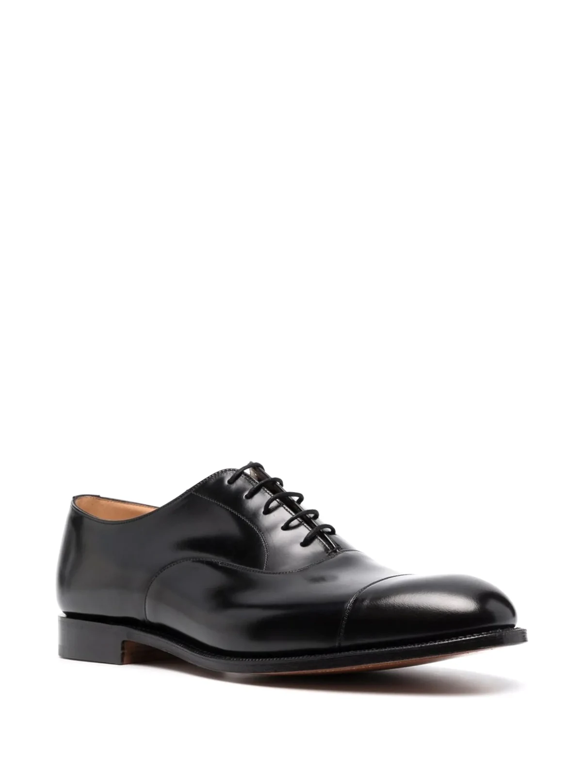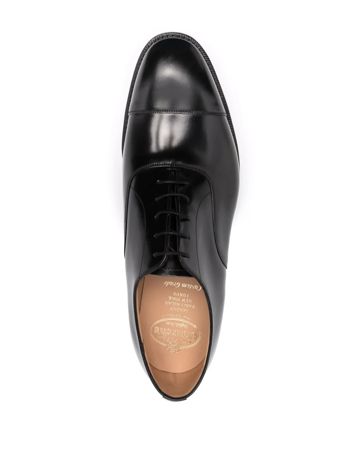 Schwarz, Leder, mandelförmige Kappe, Schnürung vorne, Logo-Prägung im Fußbett, flache Sohle.