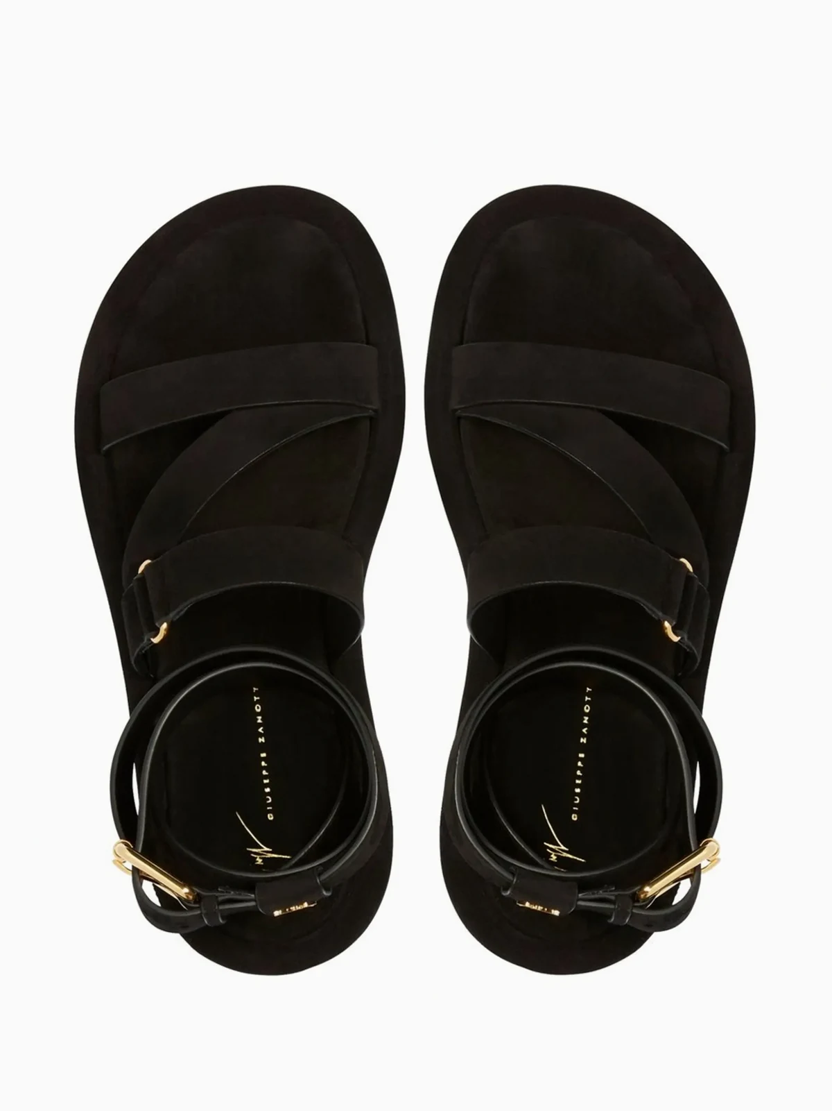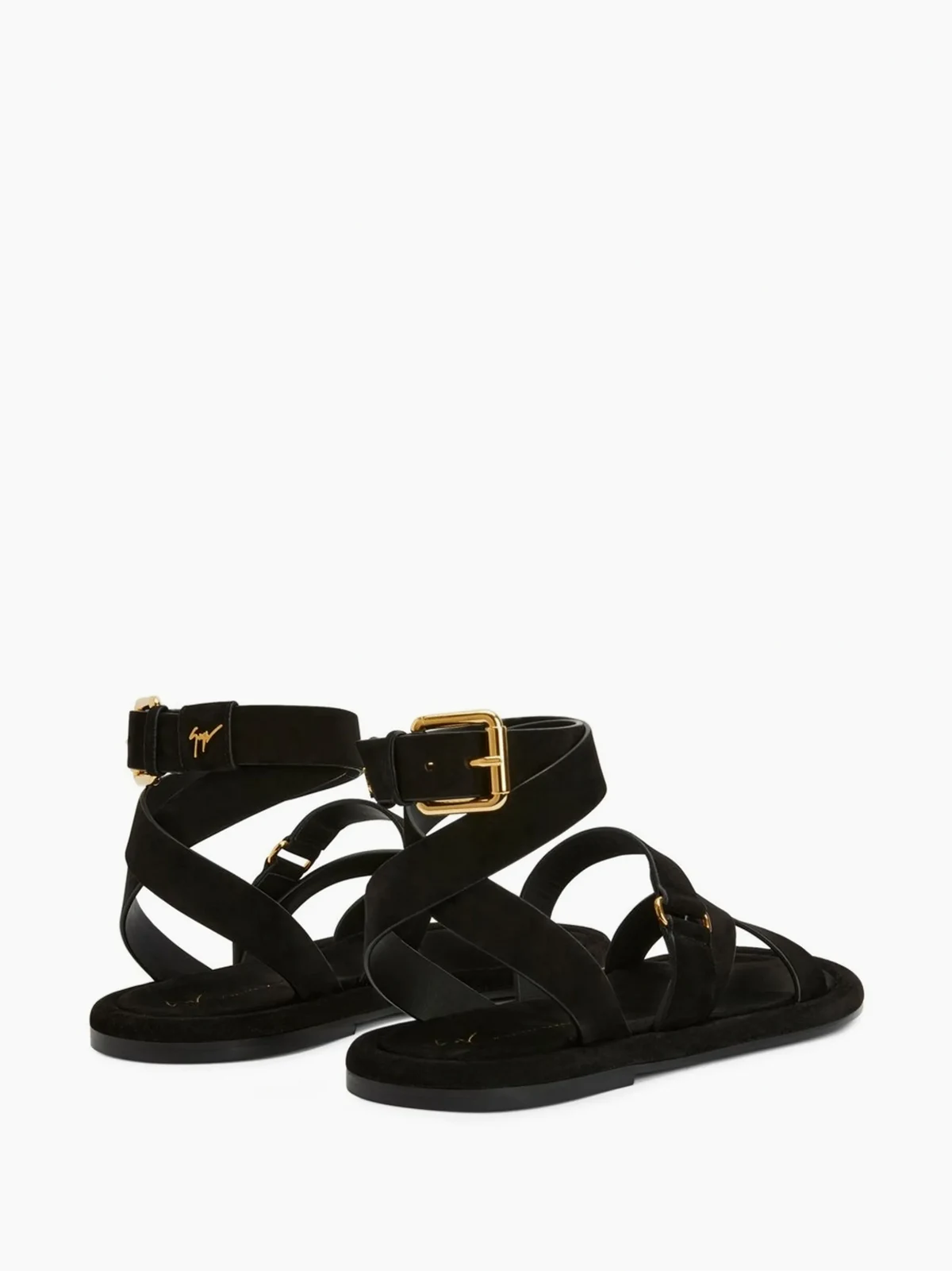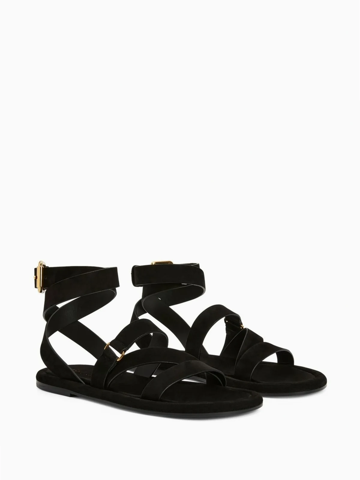 Schwarz, Wildleder, Leder, Wickeloptik, Schnallenverschluss am Knöchel, goldfarbene Beschläge, zehenfrei, Logo-Prägung im Fußbett, flache Sohle.