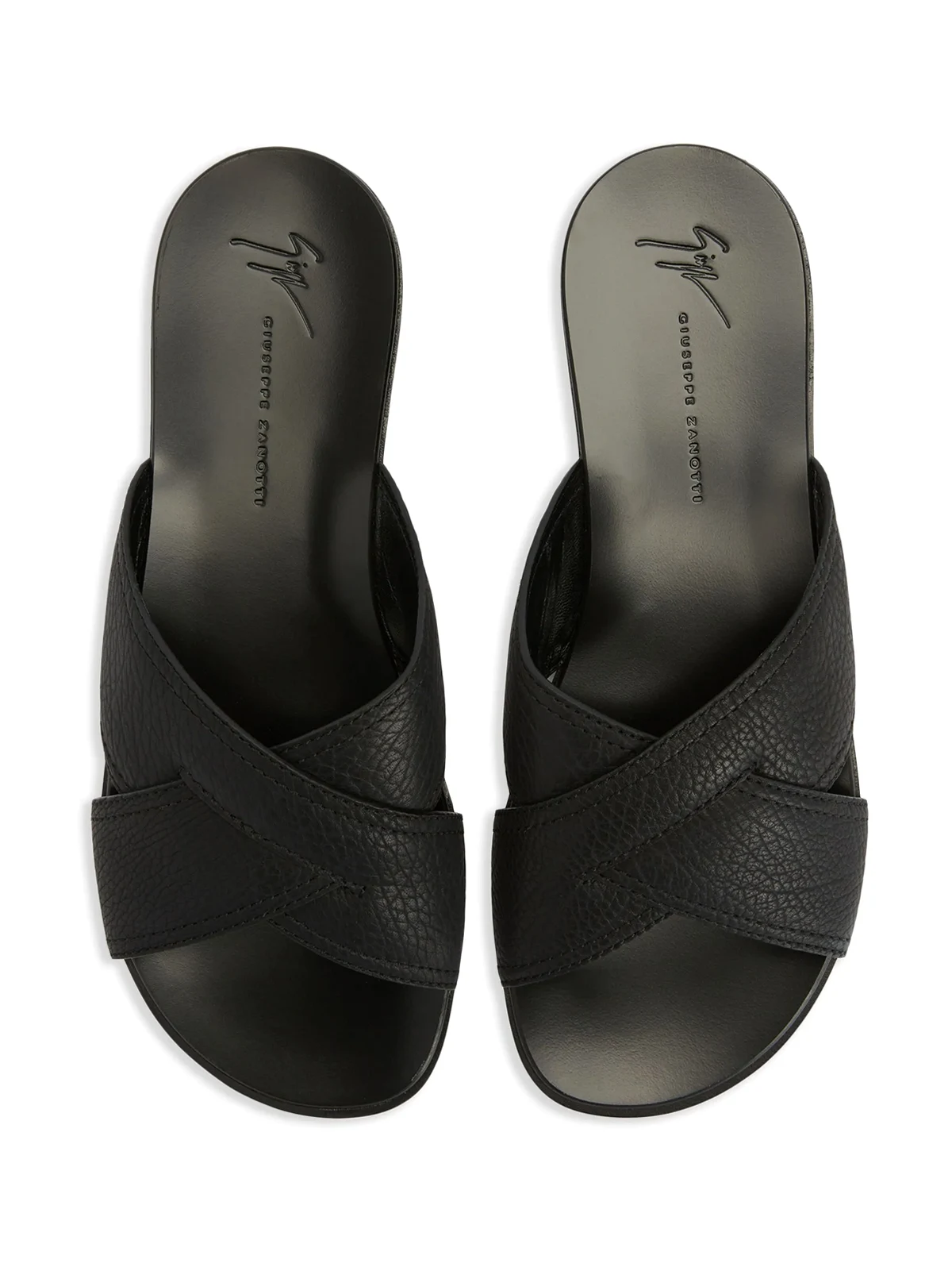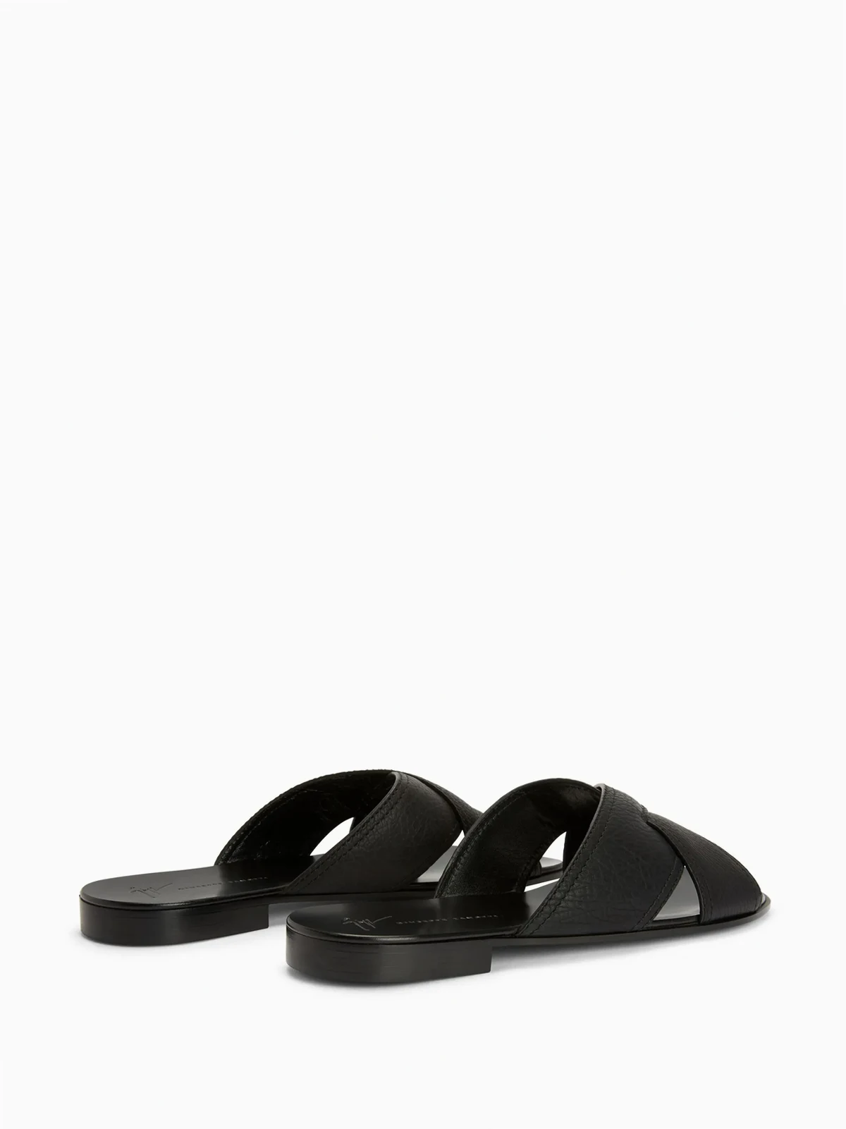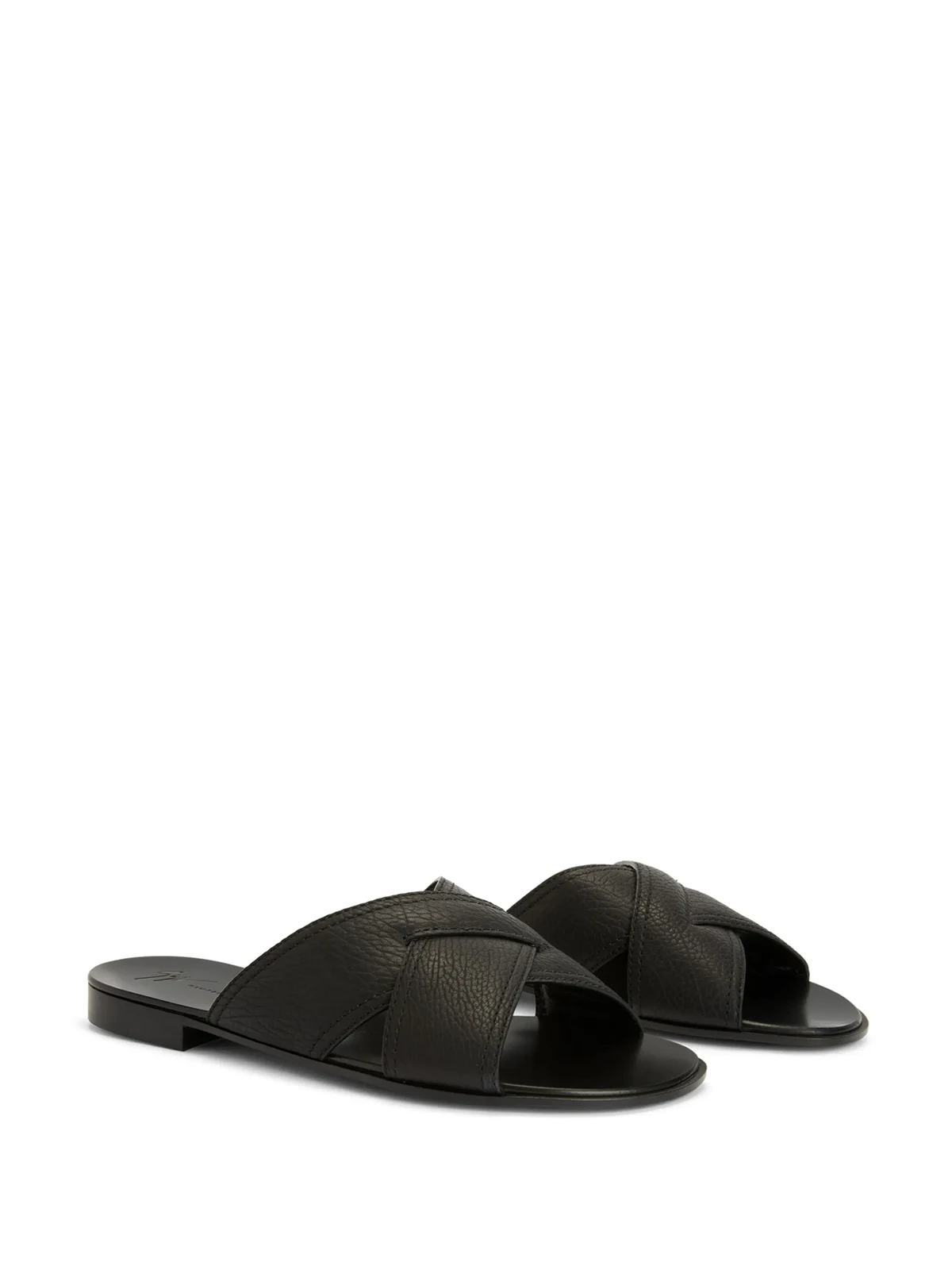 Jet Black, Leder, gekreuzte Rückenträger, gekörnte Oberfläche, Logo-Prägung im Fußbett, offene, runde Zehenpartie, niedriger Blockabsatz, flache Sohle.