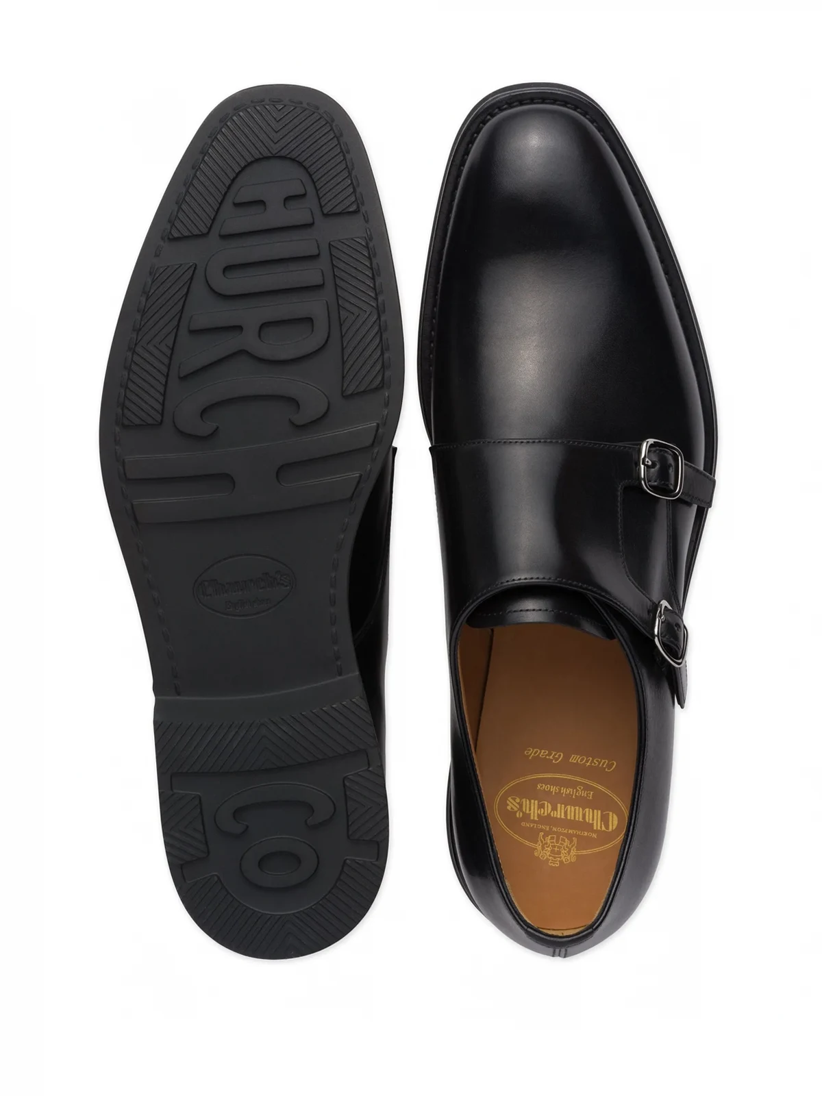 Schwarz, Kalbsleder, poliertes Finish, gleichfarbige Nähte, mandelförmige Kappe, Doppelschnalle, silberfarbener Schnallenverschluss, Lederinnensohle mit Logo-Prägung, flache Ledersohle.