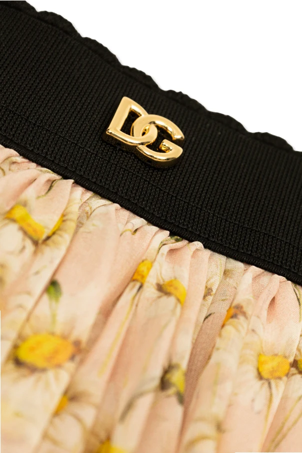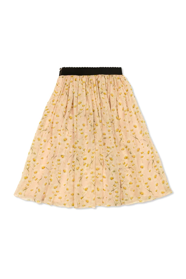 Der Rock mit Blumenmuster aus der exklusiven Dolce & Gabbana Kids Kollektion verkörpert kindliche Eleganz und mühelose Raffinesse. Der ausgestellte Schnitt, der bis unter das Knie reicht, ist kunstvoll mit zarten Falten und Rüschen veredelt, welche dem Ganzen Leichtigkeit und Volumen verleihen. Das dominante Muster aus weißen Gänseblümchen mit gelber Mitte wird durch fein abgestimmte grüne Akzente ergänzt und fügt sich harmonisch in den mediterranen Stil und mädchenhaften Charme ein.
