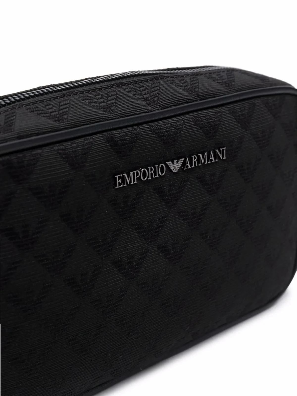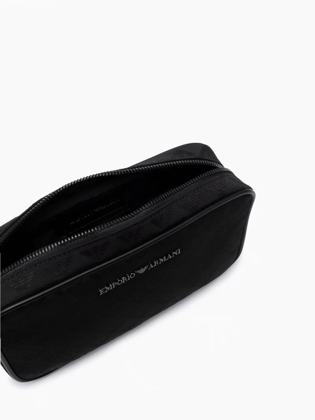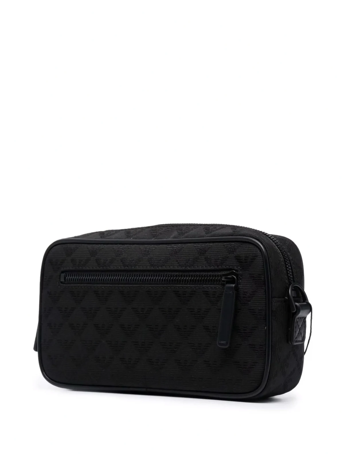 Logo-Schild, Monogrammmuster, Reißverschluss oben, Handgelenkschlaufe, Gesäßtasche mit Reißverschluss , Hauptfach. Farbe: Schwarz.