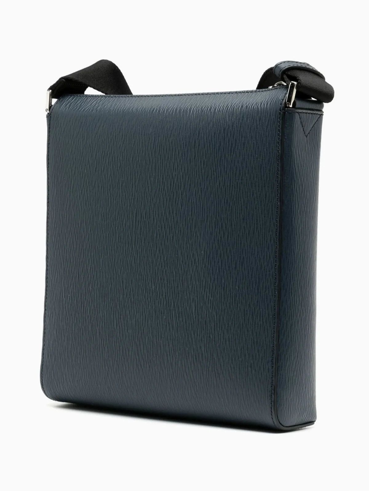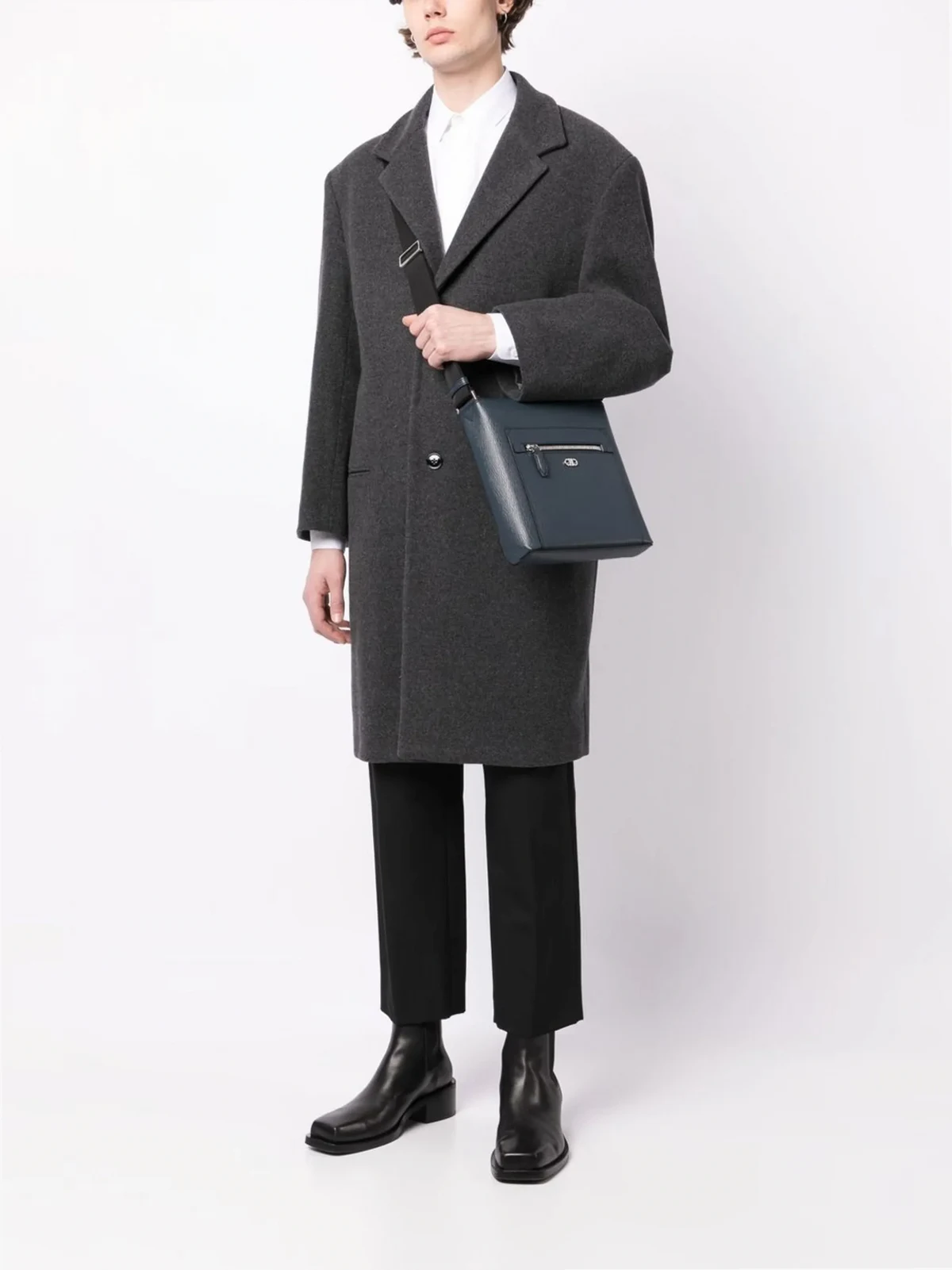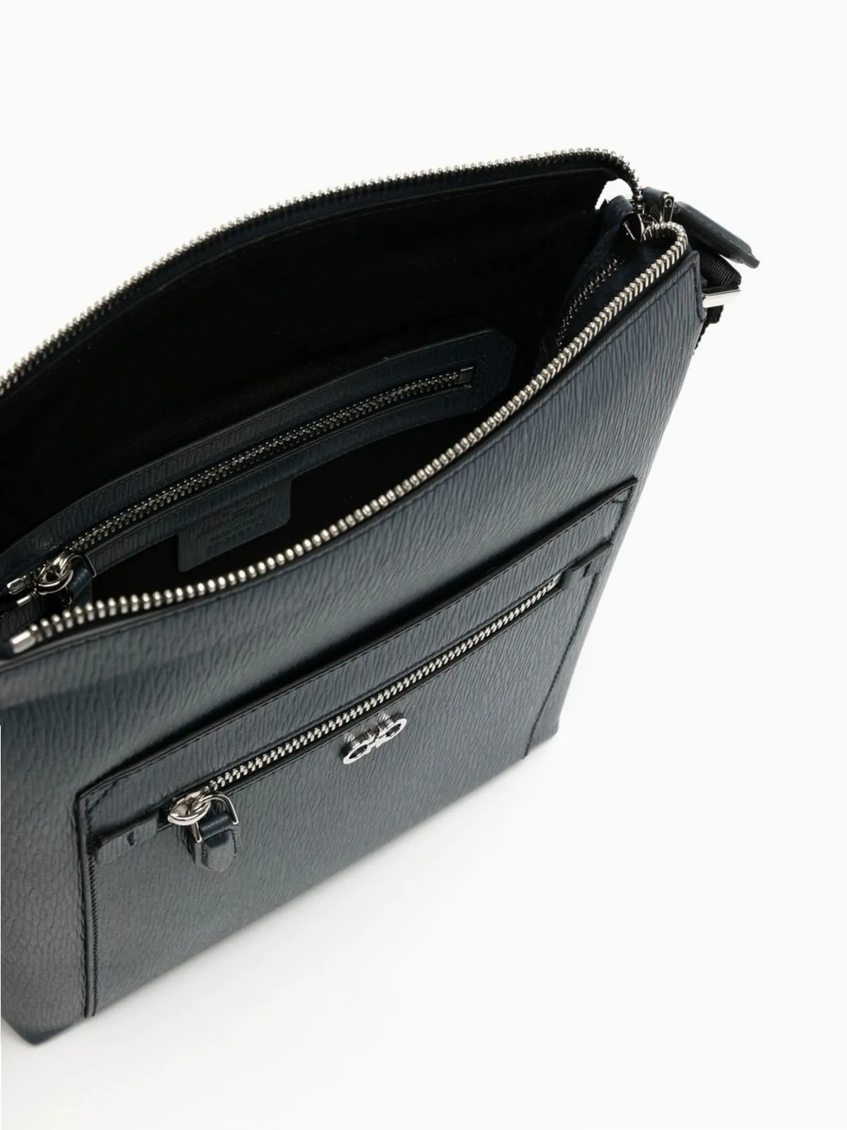 Marineblau, Leder, Gancini-Logo, Reißverschluss oben, Hauptfach, Reißverschlusstasche innen, Reißverschlusstasche vorne, verstellbarer Schulterriemen.
