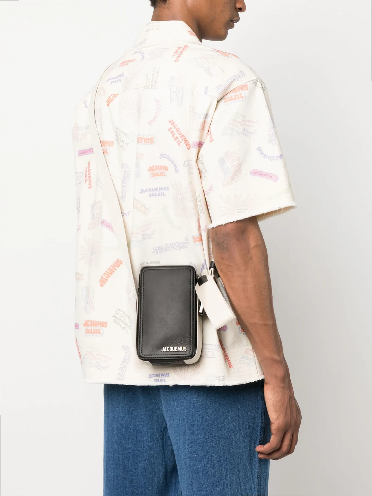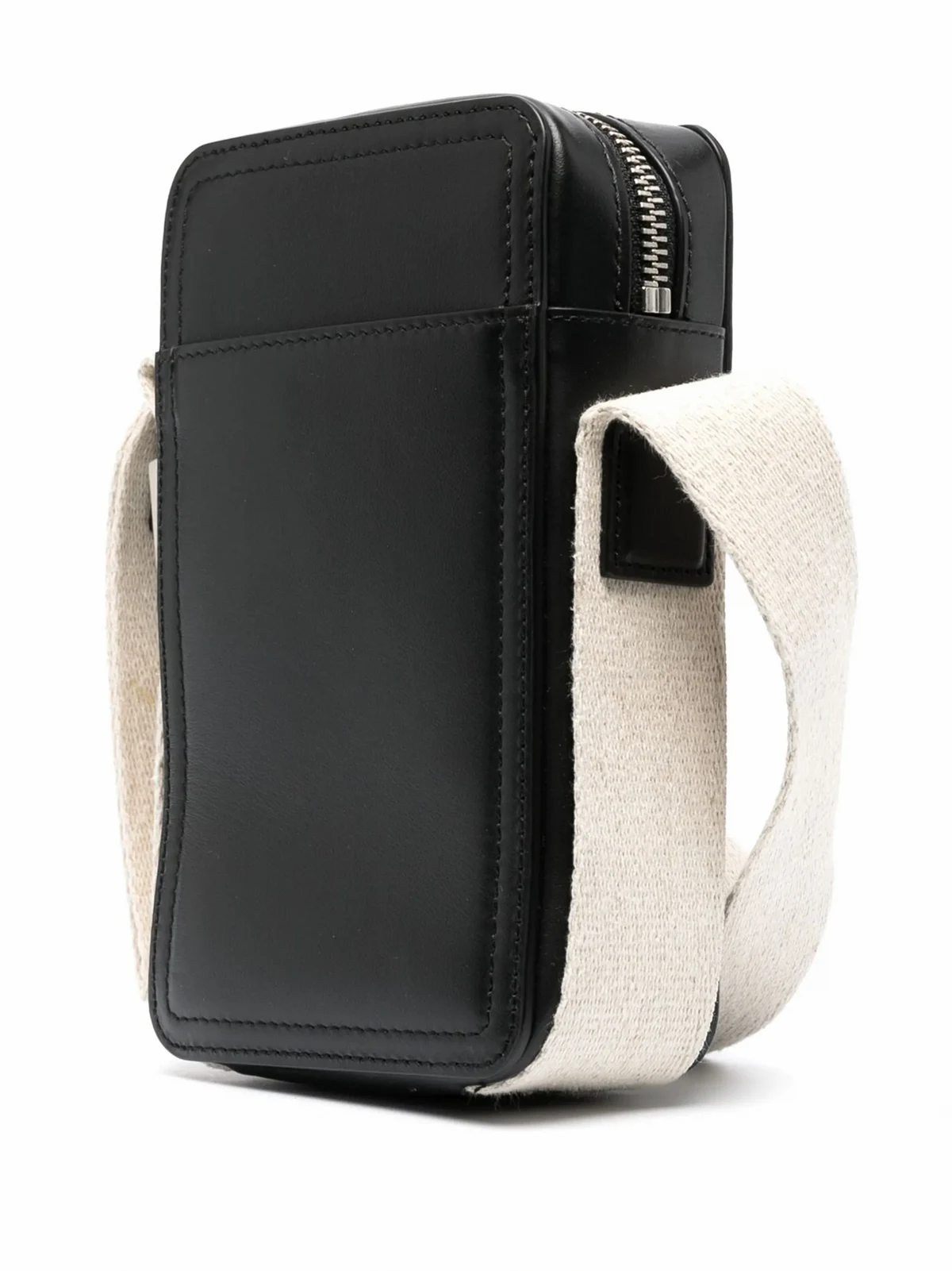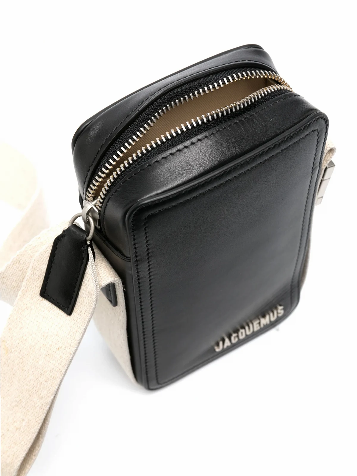 Schwarz, Hellbeige, Kalbsleder, silberfarbenes Logo, eingraviertes Logo, Reißverschluss oben, verstellbarer Schulterriemen, Hauptfach.