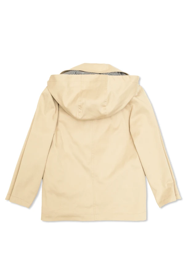Trenchcoat mit Golden Goose Kids Logo ist die Quintessenz zeitloser Eleganz und wurde für junge Modebegeisterte entworfen. Der beigefarbene Ton in Kombination mit dem diagonalen Gewebe verleiht dem Modell eine subtile Tiefe und unterstreicht die Raffinesse des Designs. Der leicht verlängerte Schnitt und die praktische Kapuze, die innen mit einem kontrastierenden schwarz-weißen Vichy-Karo ausgekleidet ist, schaffen einen harmonischen Dialog zwischen klassischer Ästhetik und moderner Lässigkeit.