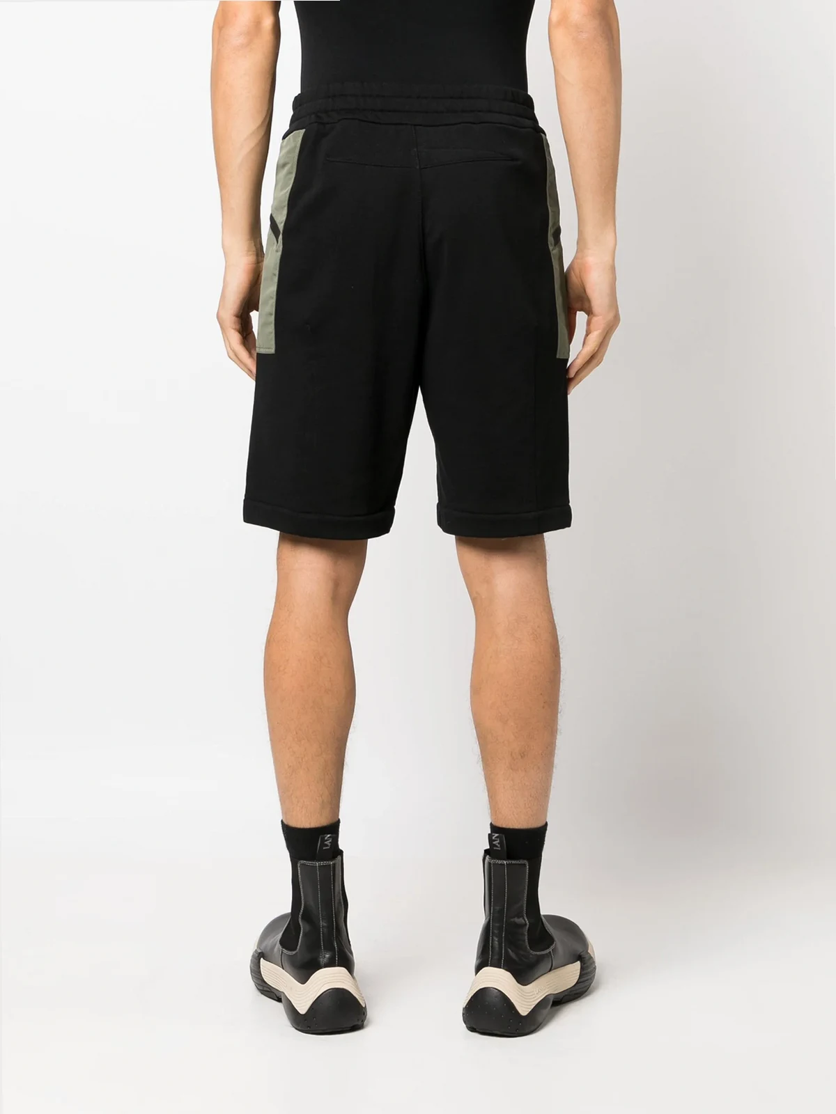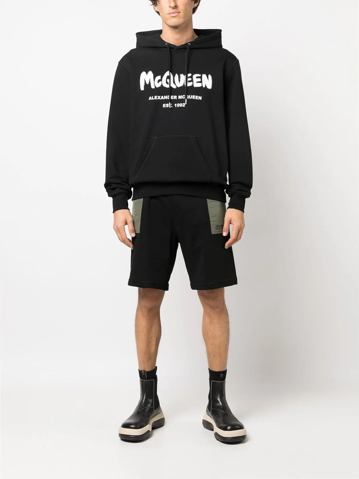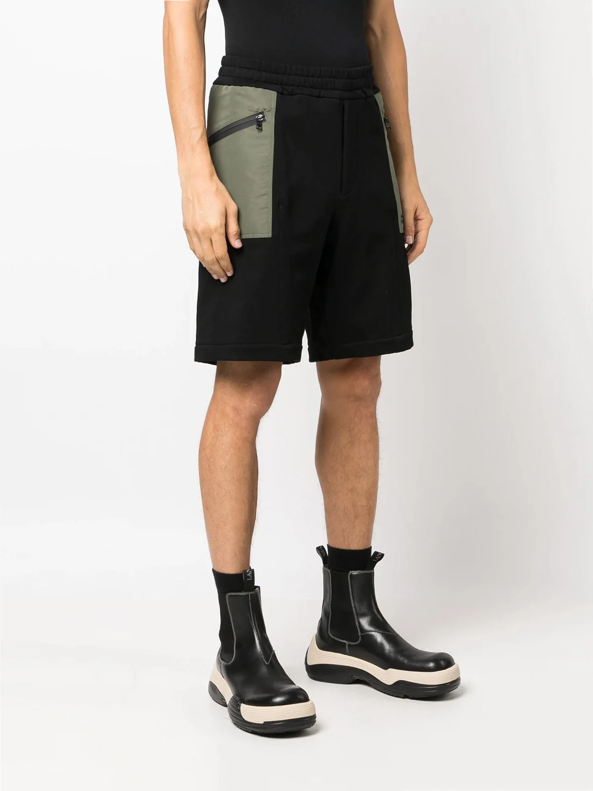 Jet Black, Olivgrün, Baumwolle, zweifarbig, Logo-Print vorne, elastischer Bund, zwei Seitentaschen mit Reißverschluss, gerades Bein, knielang.
