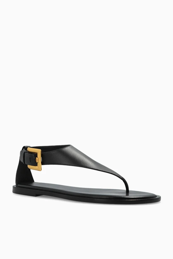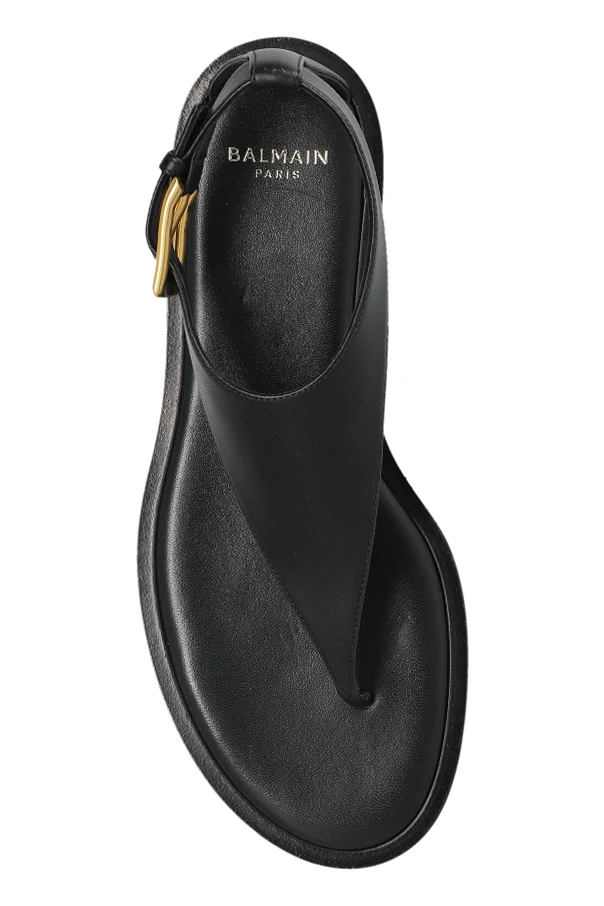 Ein Blickfang ist die große, goldfarbene Metallschnalle , die nicht nur ein elegantes Schmuckdetail, sondern auch ein funktionales Element des seitlichen Riemens ist. Das Gesamtbild vollendet eine minimalistische, schwarze Sohle. Das Innere der Sandale ist mit einer Prägung „BALMAIN PARIS“ versehen – ein Markenzeichen der exklusiven Kollektion.