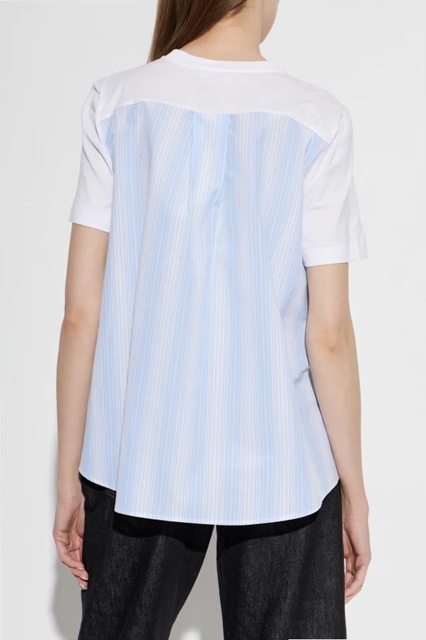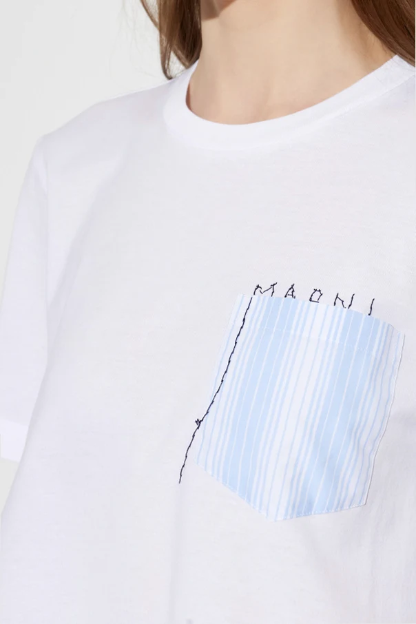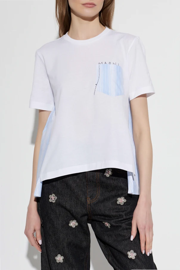 Das T-Shirt mit Tasche von Marni verbindet zeitlose Klassik mit raffiniertem Detail. Die Einzigartigkeit des Designs wird durch den weißen Farbton auf der Vorderseite unterstrichen, der zusätzlich mit einer markanten Tasche in dezenten, hellblauen Streifen und schwarzer Naht veredelt wurde. Das Rückenteil sowie die seitlichen Einsätze bestehen aus einem leichten, atmungsaktiven Material mit blau-weißen Streifen und verleihen dem gesamten Look Leichtigkeit und moderne Ausstrahlung. Das gestickte Logo von Marni oberhalb der Tasche steht für die Einzigartigkeit und garantiert die Authentizität des Produkts. Das T-Shirt ist aus hochwertigster Baumwolle gefertigt, was nicht nur Tragekomfort, sondern auch edle Langlebigkeit und elegantes Erscheinungsbild verspricht.