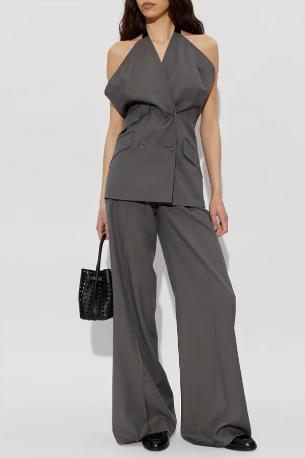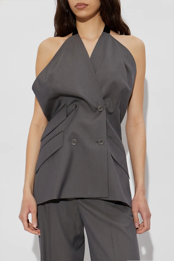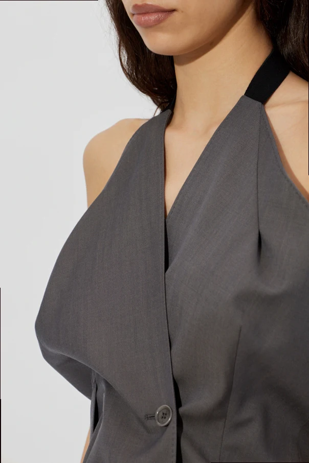 Top „Cali” von Max Mara ist ein außergewöhnliches Angebot für Kennerinnen anspruchsvoller Eleganz. Die präzise geschnittene Silhouette, inspiriert von einem klassischen Blazer, begeistert durch breite Revers und eine geometrische Form. Die stark geschlossene Vorderseite und der dezent freigelegte Halter-Rücken, betont durch einen breiten schwarzen Gürtel, schaffen eine faszinierende Komposition aus Kontrasten. Der asymmetrische Saum verleiht dem Modell einen modernen Charakter und weitet sich subtil nach unten aus.