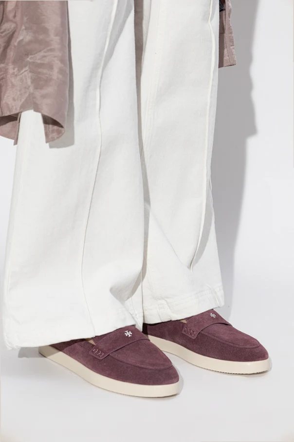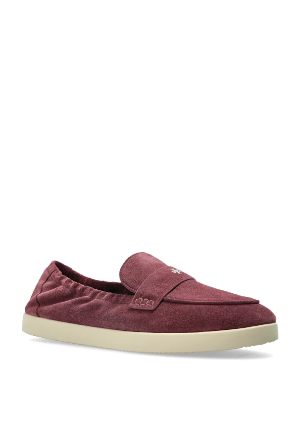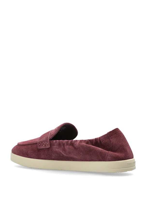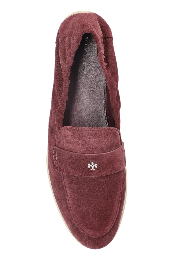 Veloursleder-Loafer der Marke Tory Burch sind die Essenz raffinierter Eleganz, eingefangen in einer klassischen, abgerundeten Form. Sorgfältig gefertigt aus weichem, hochwertigem Veloursleder in Bordeaux , begeistern sie durch ihre edle Textur und das minimalistische Design. Die Loafer zum Hineinschlüpfen, ohne überflüssige Verzierungen, präsentieren einen detailreich gestalteten Riemen mit einem kleinen, metallenen Designer-Logo in Form eines Kreuzes/einer Rosette – ein subtiler Akzent, der den außergewöhnlichen Charakter des Schuhs unterstreicht.