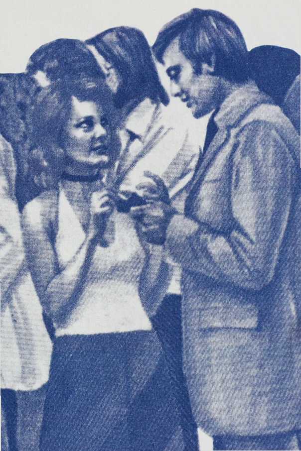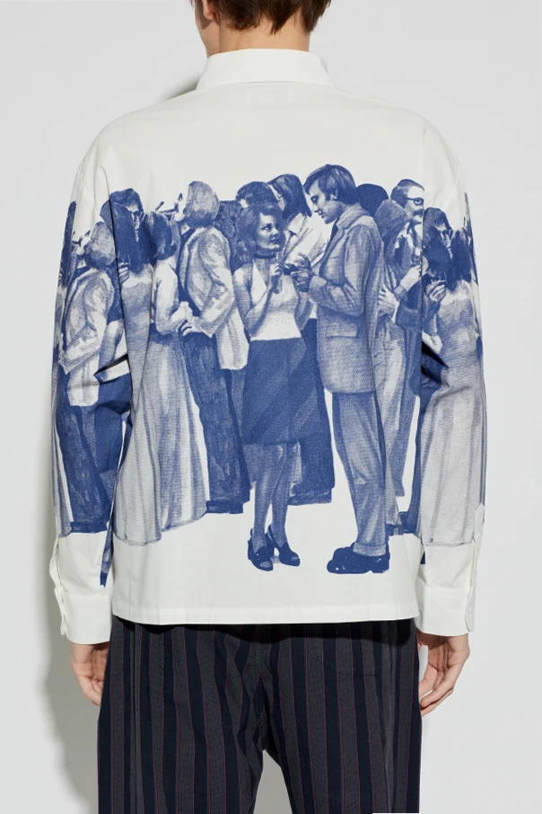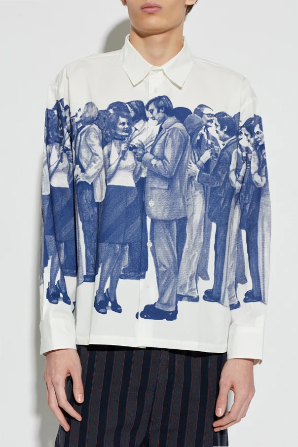 Die weiße Farbe bildet die perfekte Basis für ein wahres Kunstwerk – eine realistische Grafik in sanften Blautönen, die eine Gruppe von Menschen im Gespräch darstellt. Das Muster erstreckt sich harmonisch über die gesamte Fläche des Hemdes und erinnert an klassische Illustrationen sowie an die Atmosphäre der Retro-Fotografie.