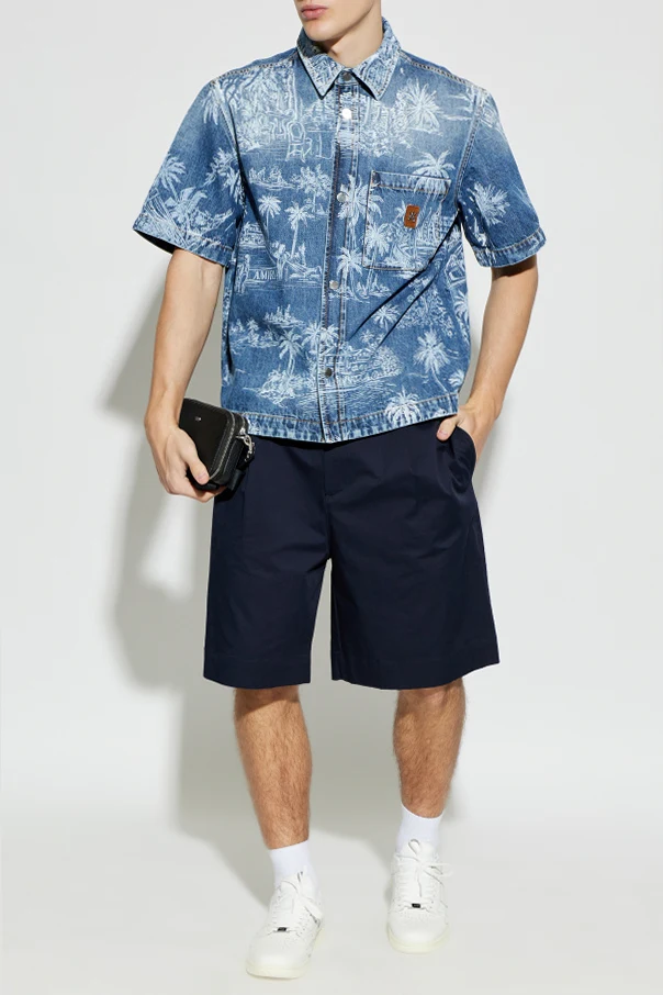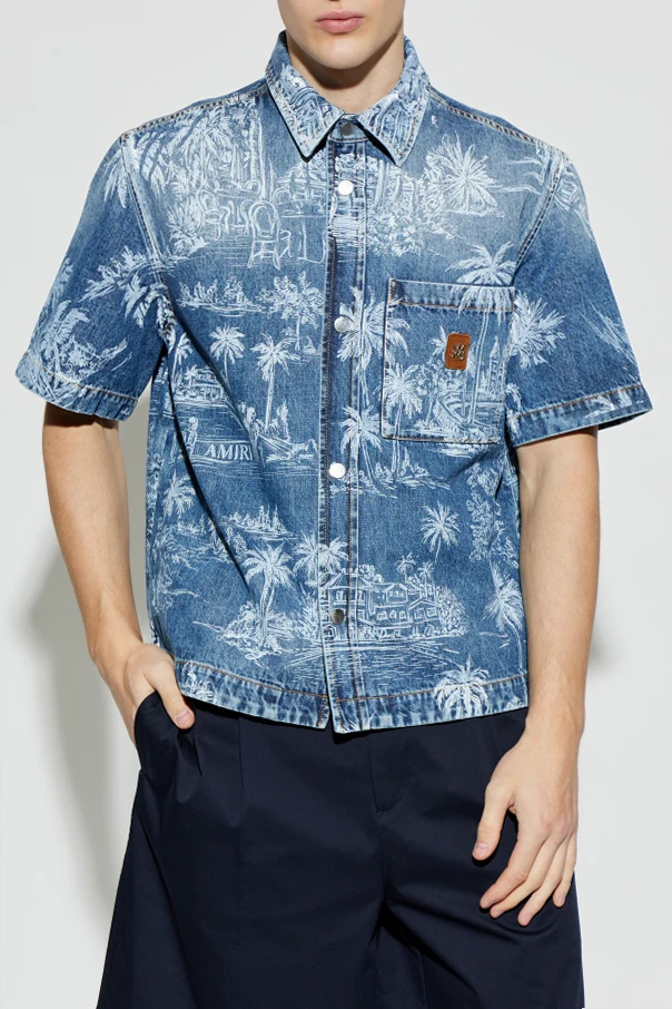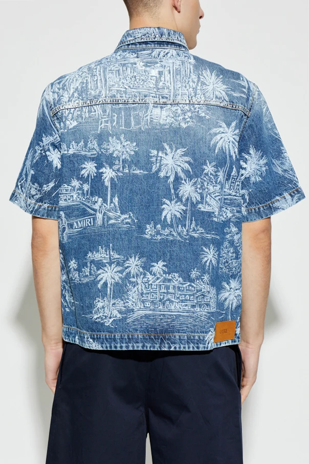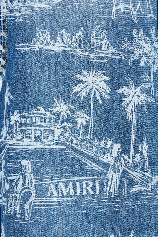 Ein einzigartiger Print in hellen Nuancen, der tropische Szenen zeigt: Palmen, Häuser, Silhouetten von Menschen und Landschaften, unterstreicht den individuellen Charakter des Designs. Auf der Vorderseite hebt sich ein dezentes, braunes Lederpatch mit dem Markenlogo ab, und das Ganze wird durch das in das grafische Element integrierte „AMIRI“-Schriftzug vollendet.