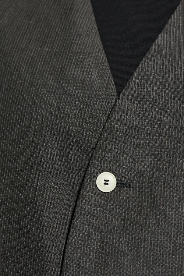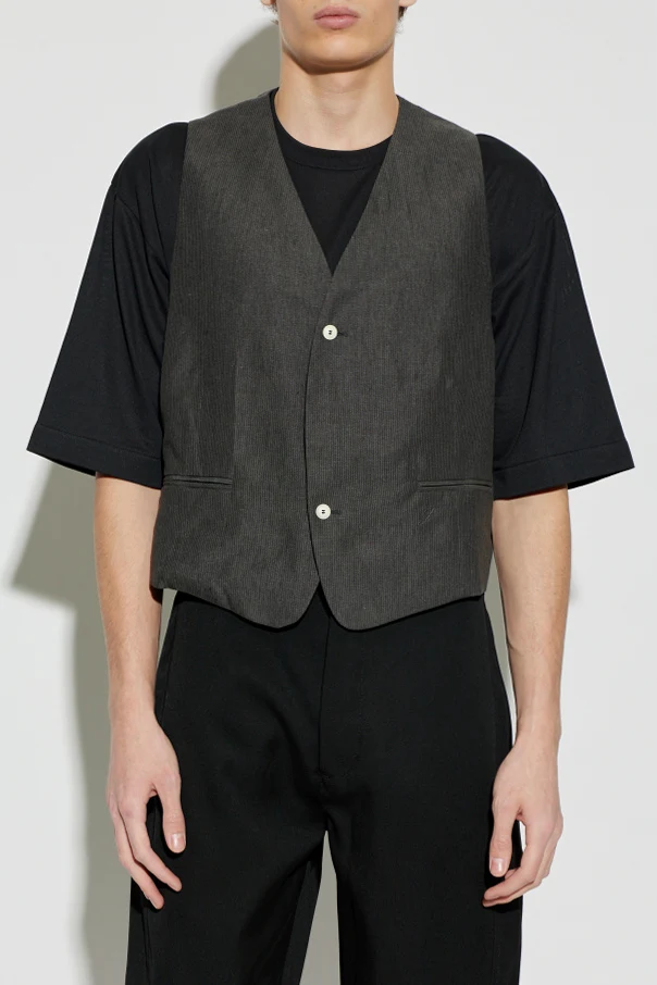 Der edle, strukturierte Stoff besteht zu 100% aus Leinen in einem grauen Farbton und ist mit einem feinen, gerippten Muster veredelt, das dem Design eine elegante Tiefe verleiht. Zwei kontrastierende, helle Knöpfe auf der Vorderseite, dezent horizontale Eingrifftaschen sowie aufwendig geführte Nähte unterstreichen die Einzigartigkeit des Modells, ohne die minimalistische Form zu stören.