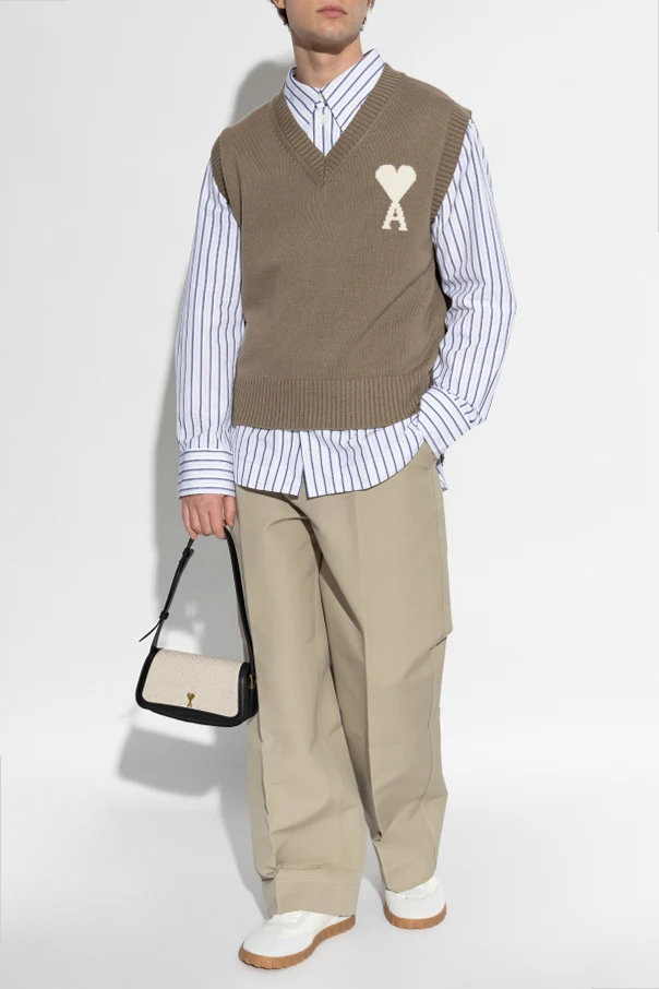 Das auffällige, kontrastierende Herzmotiv, das mit dem Buchstaben "A" auf der linken Brust verwoben ist, dient als Erkennungszeichen und hebt die Einzigartigkeit dieser Weste sowie ihre Zugehörigkeit zur Kollektion des renommierten französischen Modehauses hervor. Der breite, tiefe V-Ausschnitt verleiht der Silhouette Leichtigkeit und raffinierte Schlichtheit.