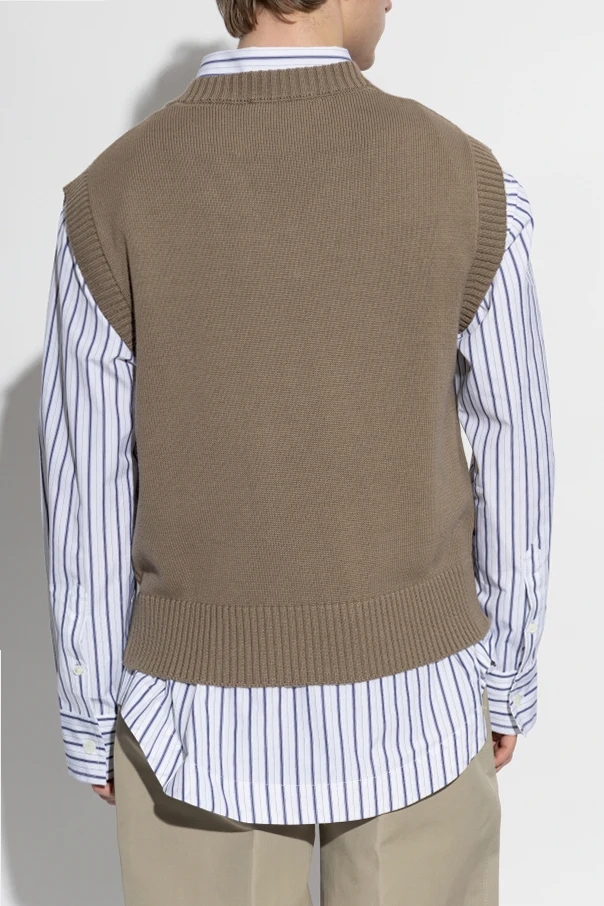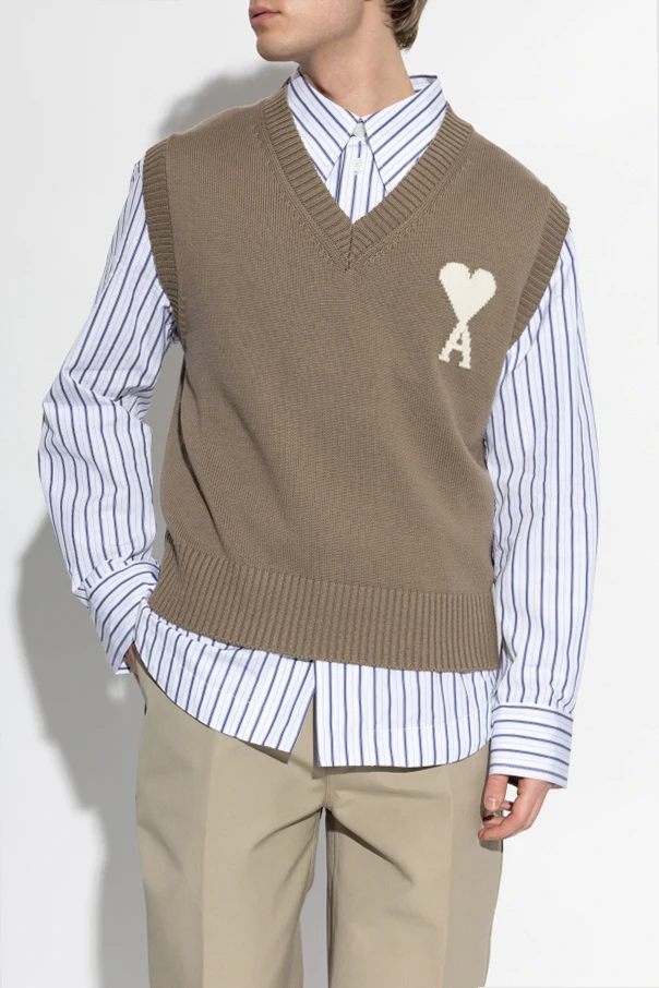 Ärmellose Strickweste mit V-Ausschnitt von Ami Alexandre Mattiussi verkörpert das Wesen des Pariser Chics und zeitgenössischer Eleganz. Das sorgfältig von Hand gearbeitete Strickmaterial mit markanter Struktur aus einer ausgewählten Mischung aus Wolle und Baumwolle präsentiert sich in einem tiefen, braunen Farbton, der den raffinierten Charakter dieses Produkts unterstreicht. Der klassische, gerade Schnitt, breite Abschlüsse an Ärmeln und Halsausschnitt sowie stark gerippte Bündchen harmonieren perfekt mit der subtilen Lässigkeit, die das Haus AMI auszeichnet.