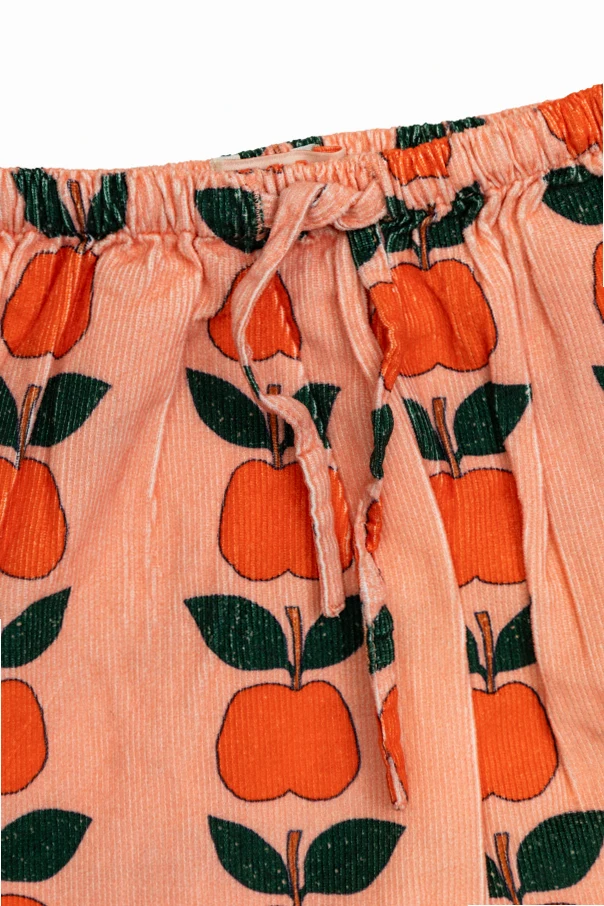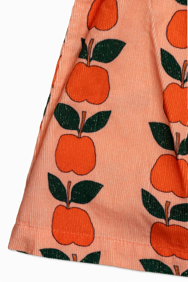 Gefertigt aus edlem, geripptem Cordstoff, begeistert er mit einem auffälligen Muster großer, stilisierter Früchte in intensiven Orange- und Grüntönen, die sich auf einem zarten Rosahintergrund verteilen. Der besondere Charakter des Rocks wird durch einen sorgfältig verarbeiteten, elastischen Bund mit Kordel unterstrichen, der eine perfekte Passform an die Kindesfigur gewährleistet.