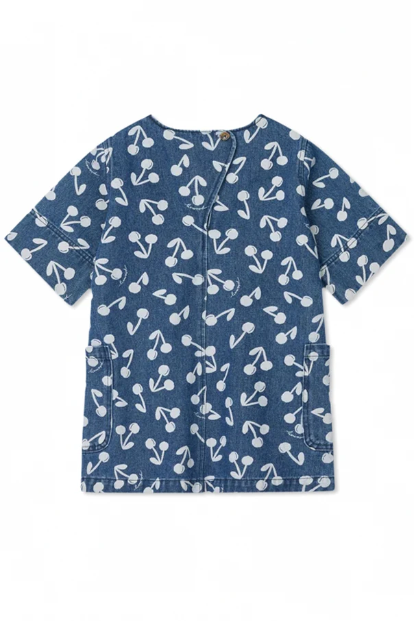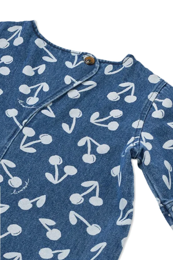 Der marineblaue Hintergrund, bedeckt mit einem markanten dekorativen Muster aus weißen Kirschen, sorgt für ein unverkennbares Motiv, das perfekt die kindliche Sensibilität anspricht. Der weiche, jerseyähnliche Stoff aus Bio-Baumwolle schmiegt sich sanft an die Haut und vermittelt ein einzigartiges Gefühl von Luxus und Natürlichkeit.