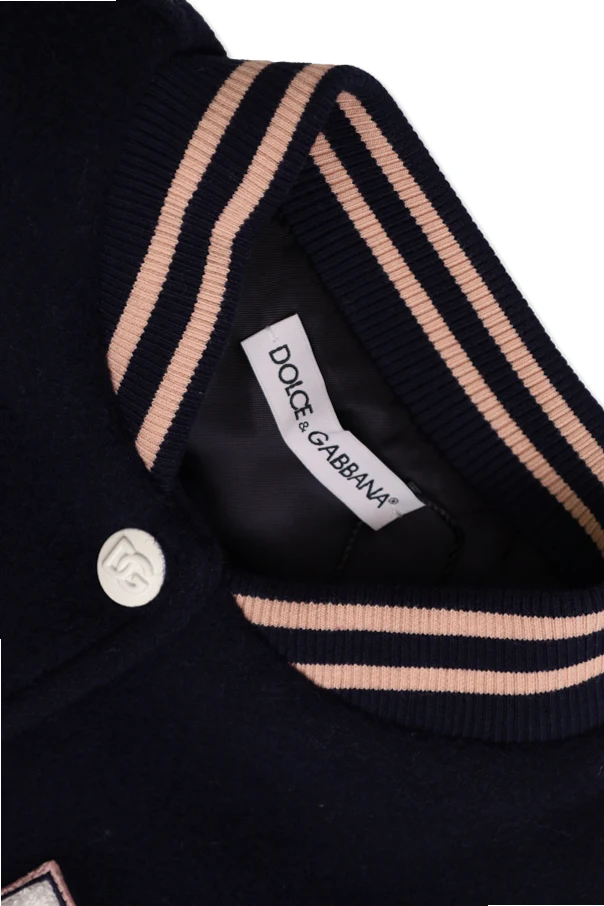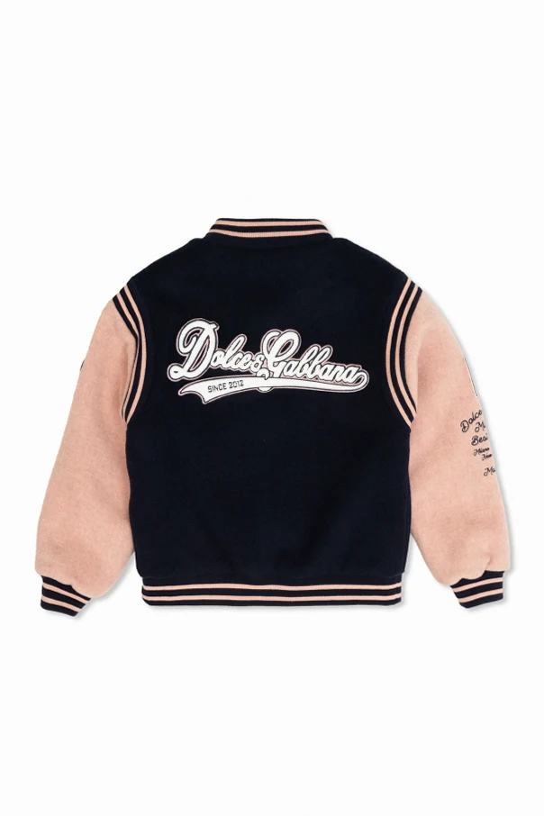 Die Bomberjacke von Dolce & Gabbana Kids ist eine raffinierte Wahl für junge Modebegeisterte und vereint einen klassischen Schnitt mit modernen Akzenten. Die rosafarbenen, samtig weichen Ärmel bilden einen Kontrast zum navyblauen, wollähnlichen Korpus und schaffen einen charakteristischen Varsity-Look. Gerippte, elastische Bündchen verleihen dem Design Leichtigkeit und sorgen für angenehmen Tragekomfort.