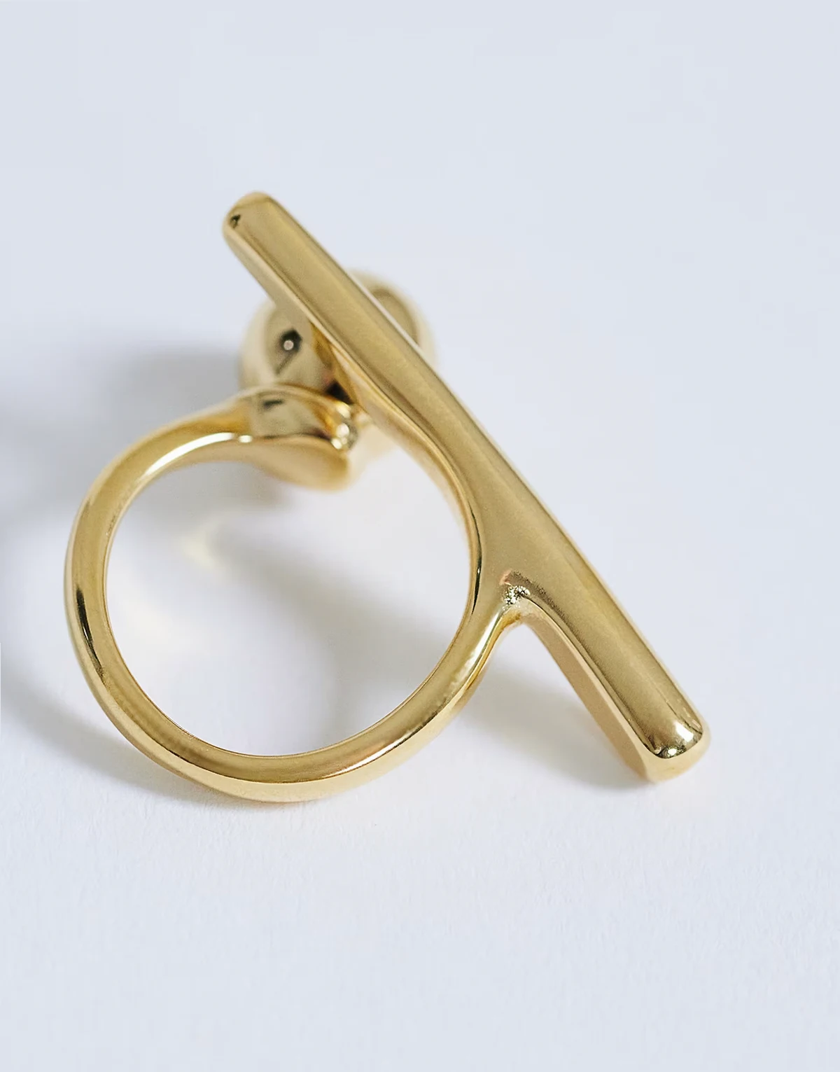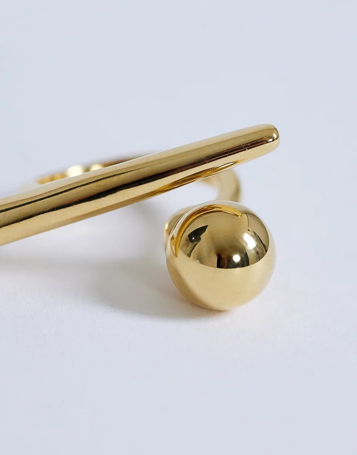 Der Ring Ramona besteht aus einem schmalen Band mit einem abstrakten, skulpturalen Design. Er ist mit einem Steg- und Kugeldetail versehen und aus goldfarbenem Edelstahl gefertigt.