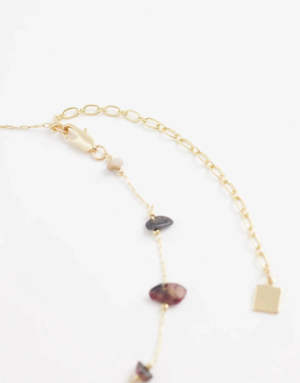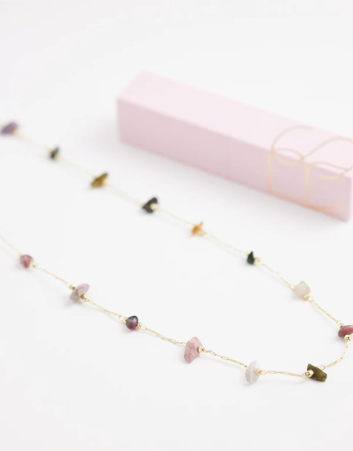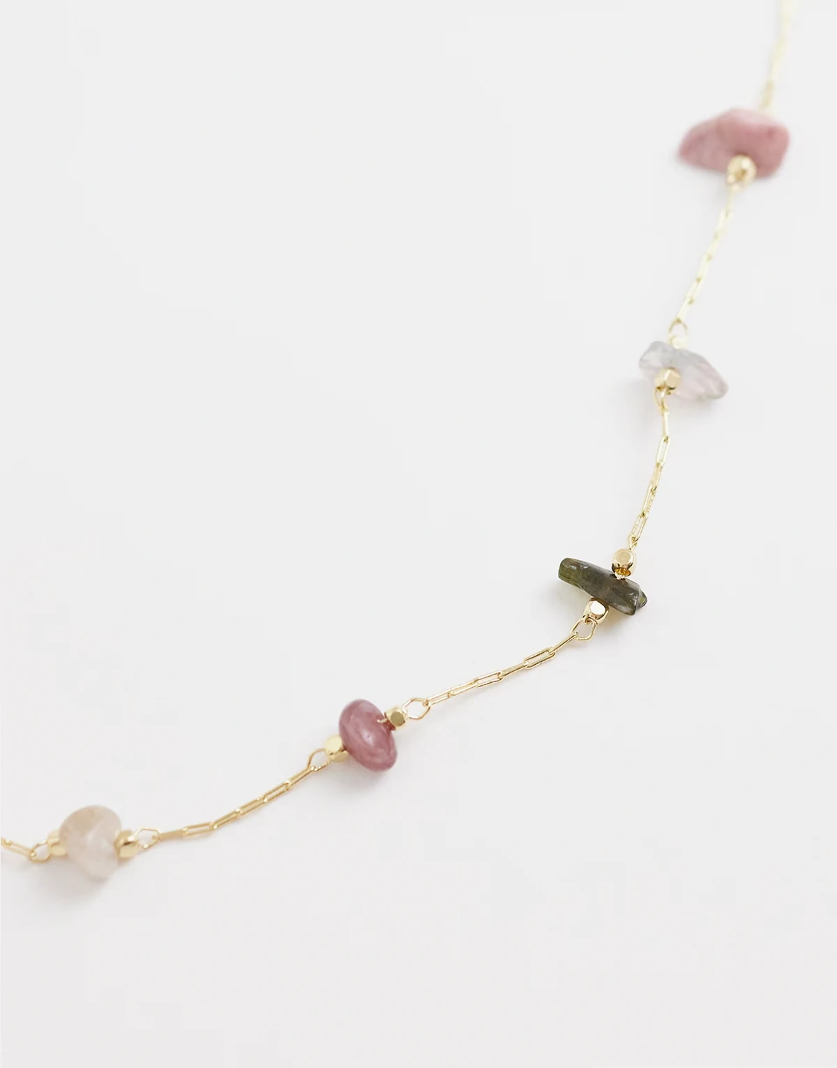 – Zarte, goldfarbene Halskette mit rosa Steinsplittern